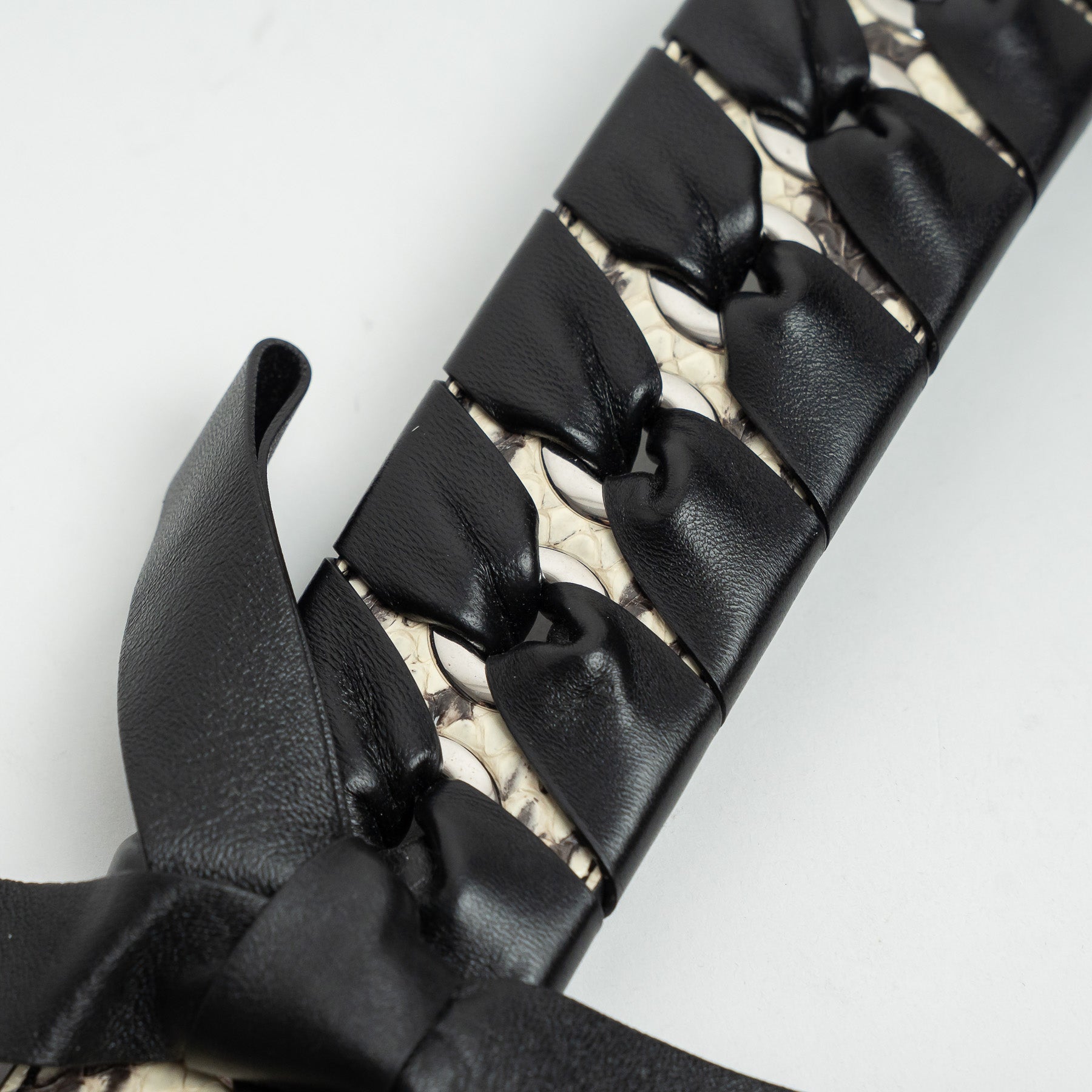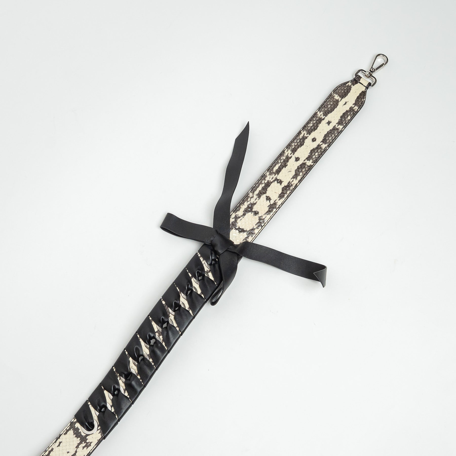 - Features: Leather ribbon tied in a bow through grommets, Two clasps, Red leather interior, Python Leather exterior