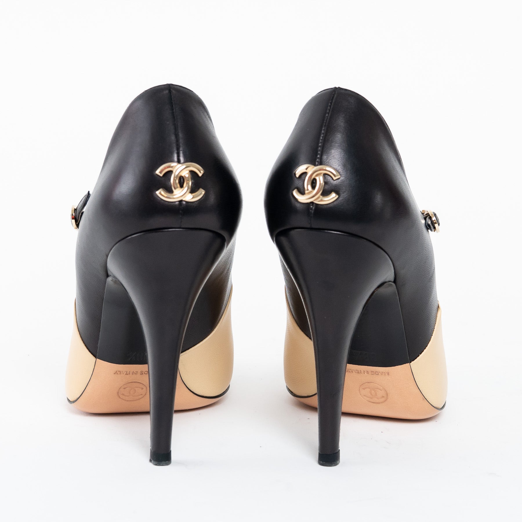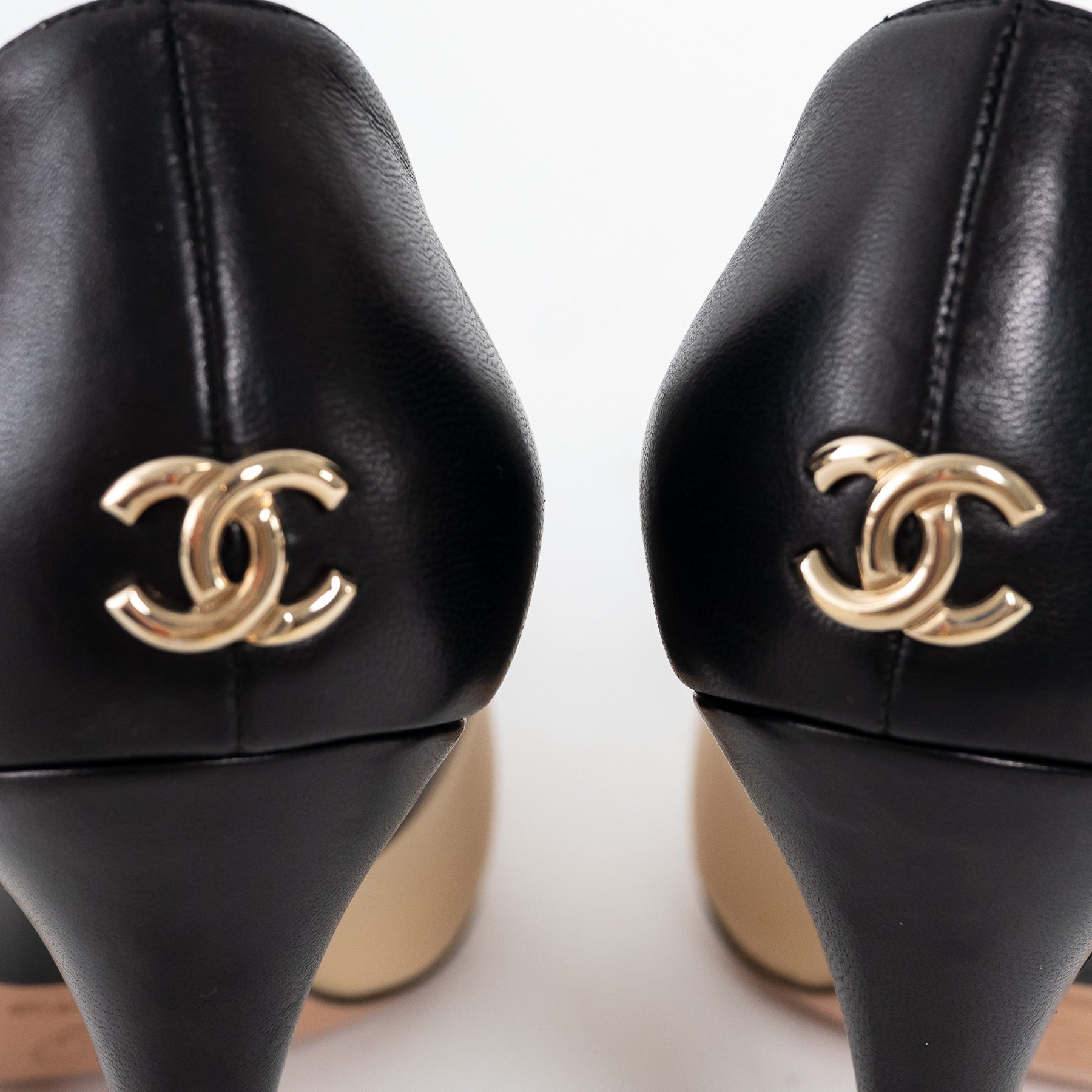 Pre-Loved Chanel™ Two Tone Black Beige Calfskin Leather Pumps Size 38.5