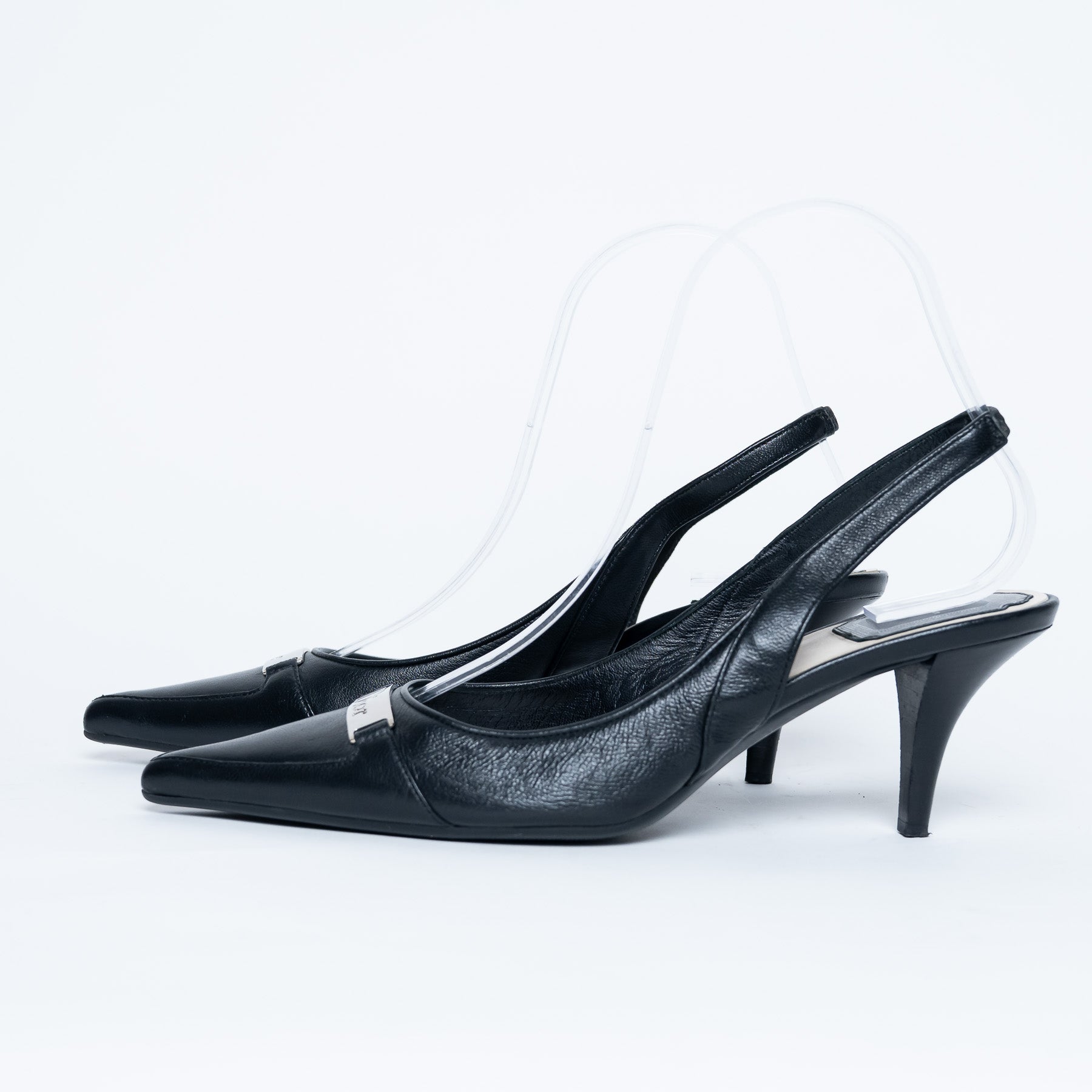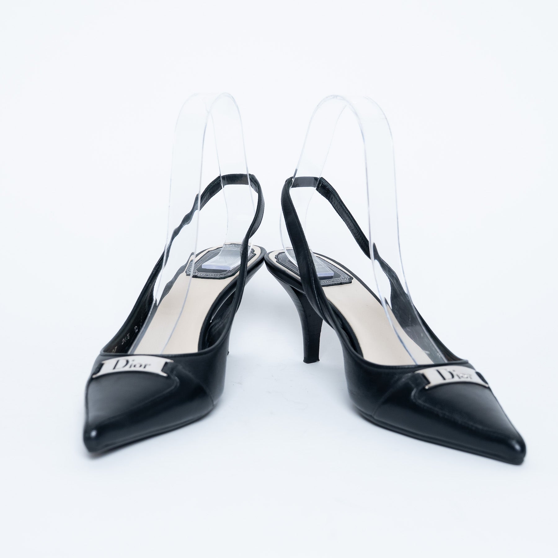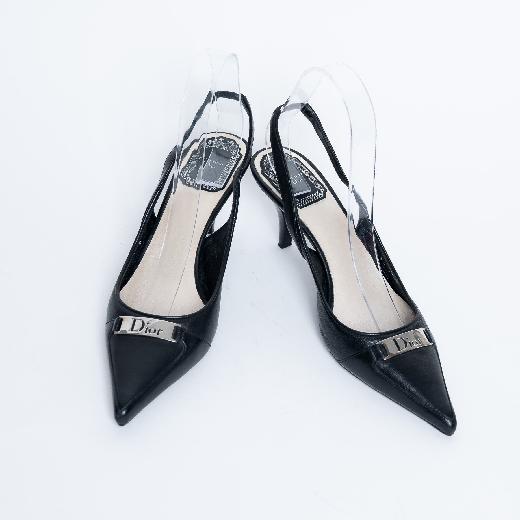 - Features: Pointed toe, black leather outer, beige leather insole, silver plaque with "Dior" cutout
