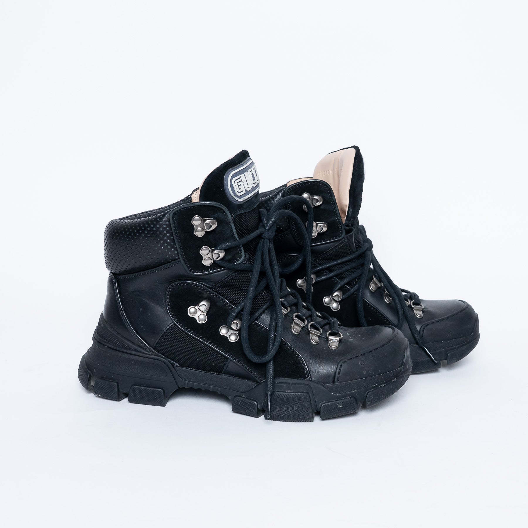 - Features: Round toe, leather upper with technical fabric and suede details, grey hardware, chunky rubber lug sole