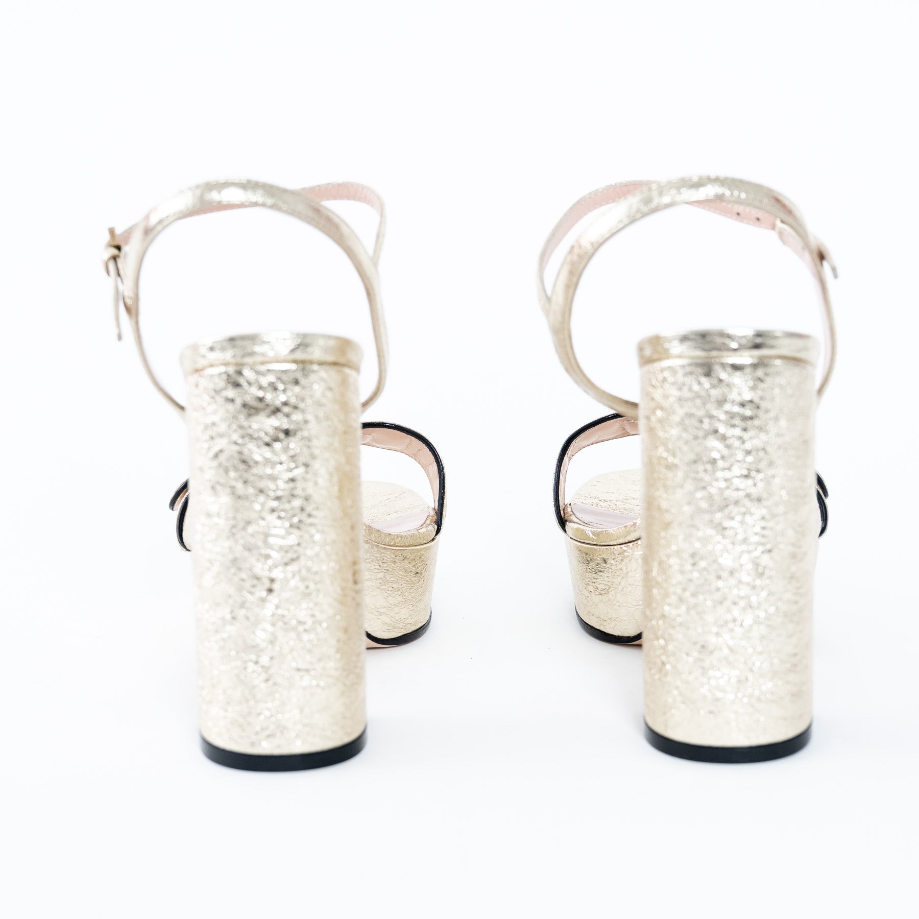 - Features: Platform heel sandals crafted in gold-leafed leather to create a crinkled effect, adjustable leather ankle strap, classic GG Marmont logo in aged gold-tone hardware, platform and block heel, and nude leather lined