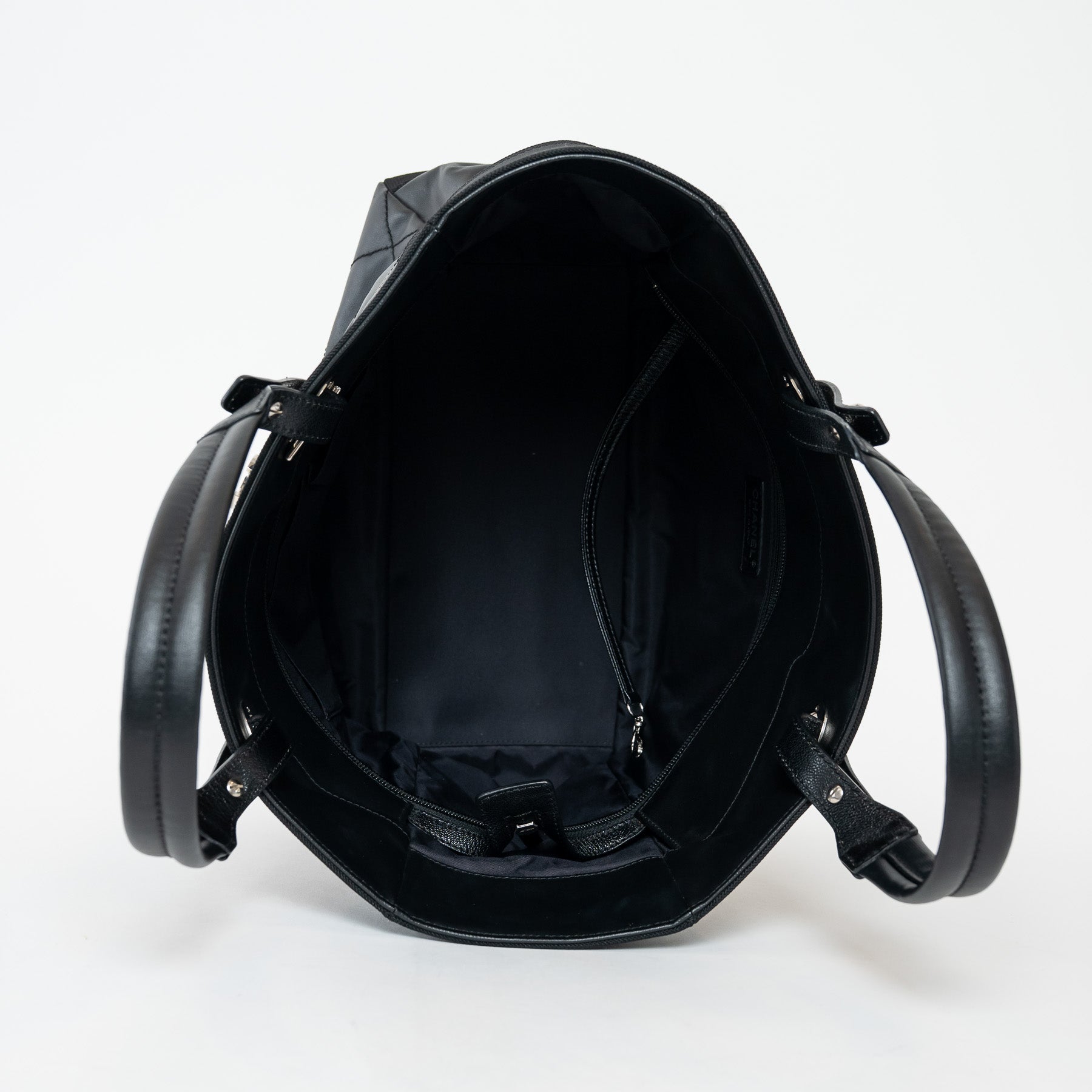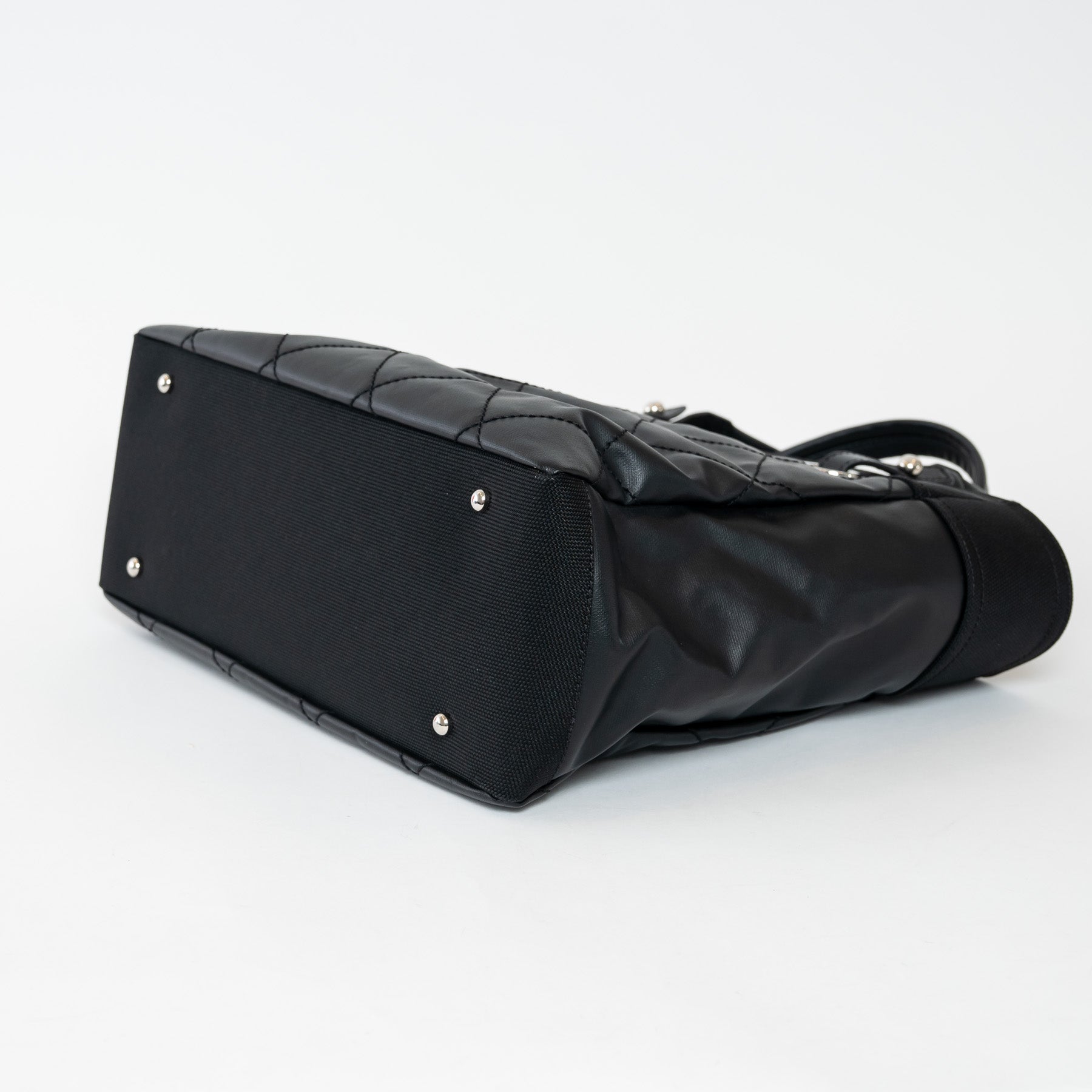 - Exterior Features: Paneled design with quilted stitching, Interlocking letter logo charm, Two adjustable top handles, Four protective studs at base