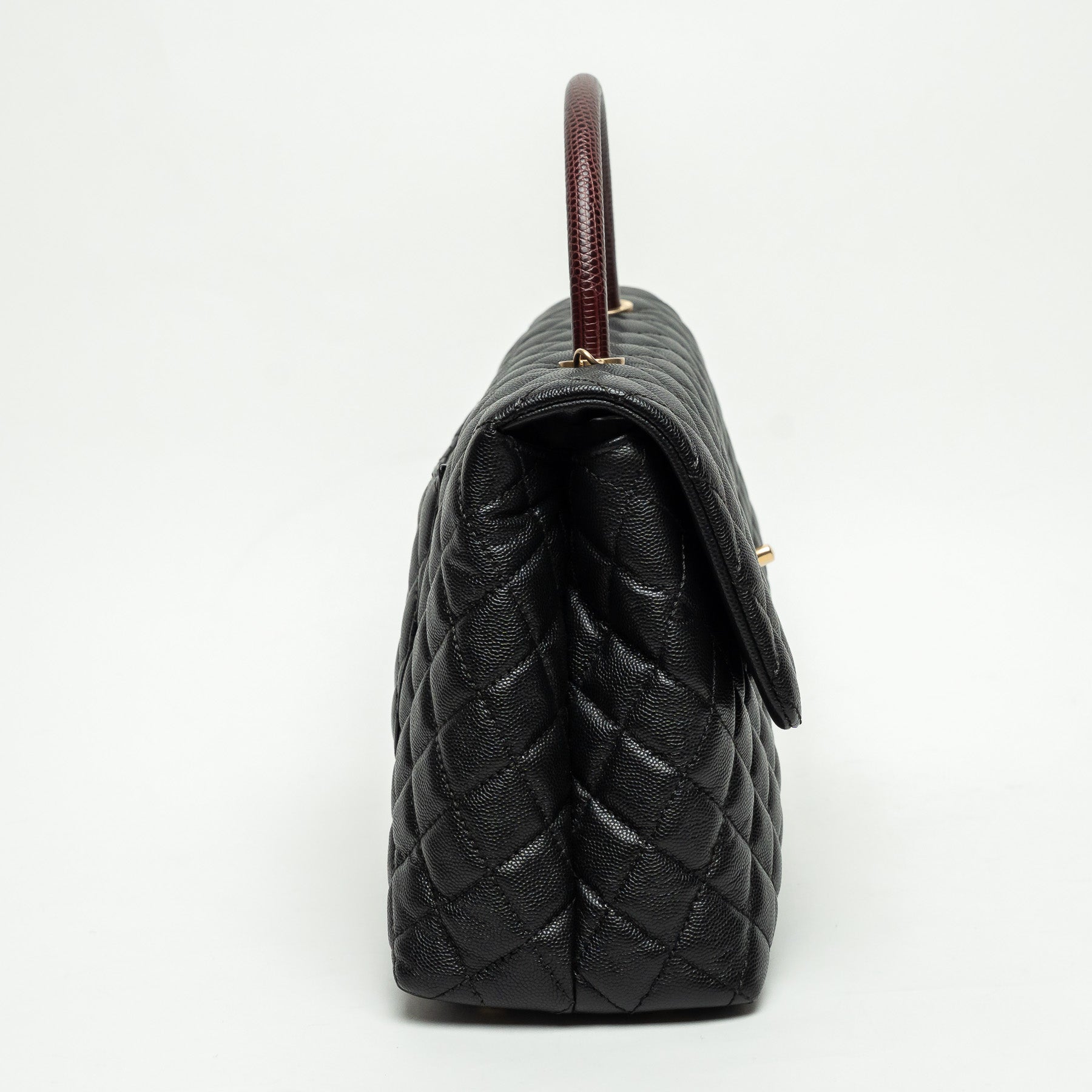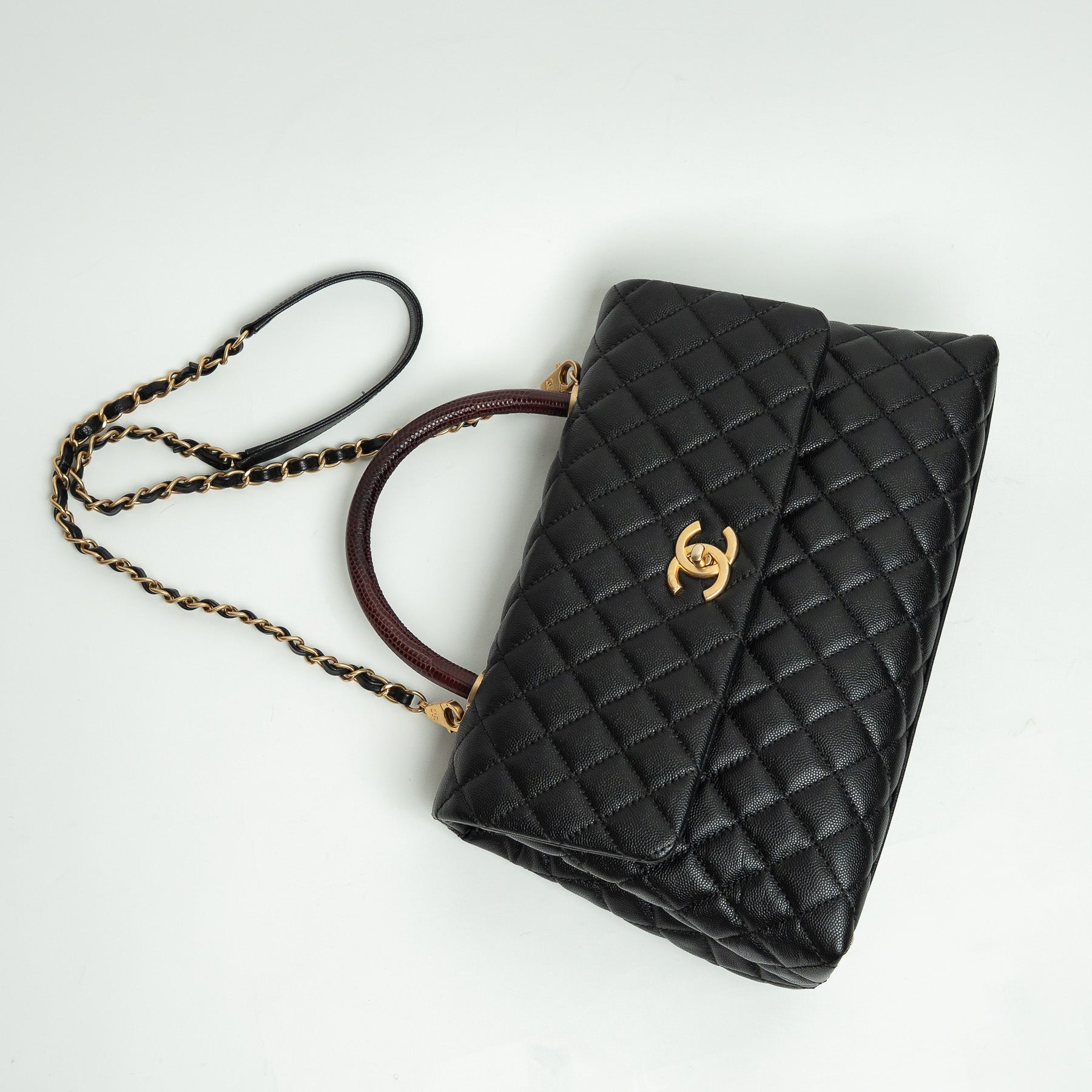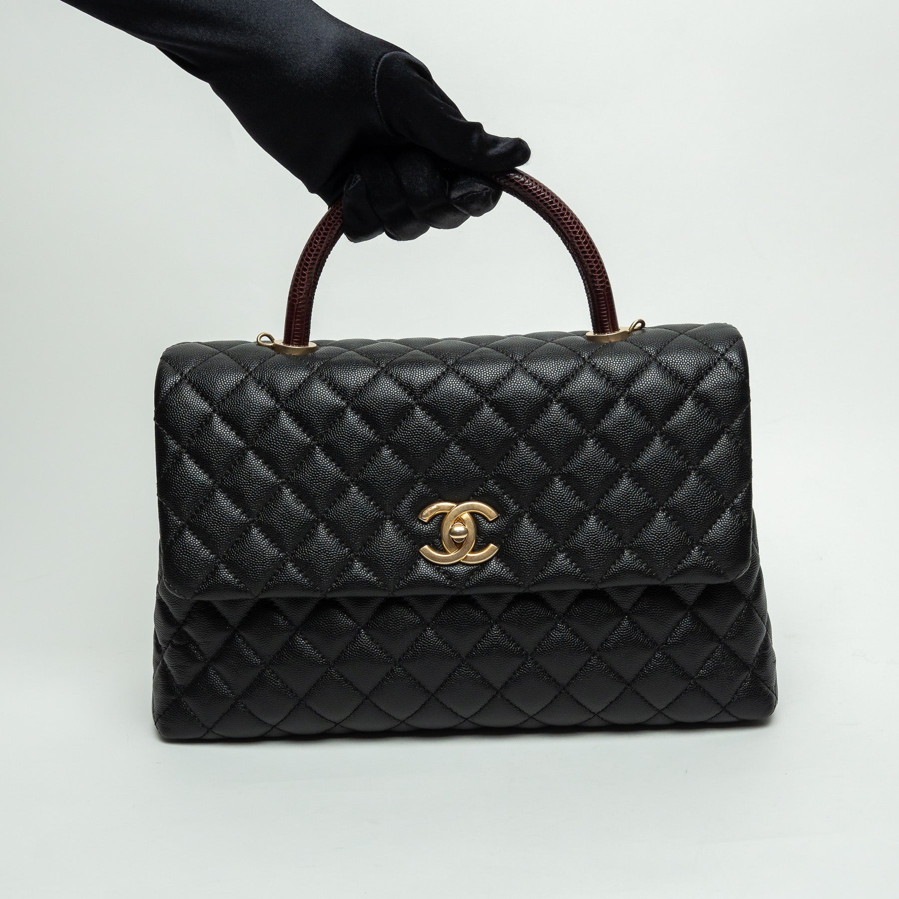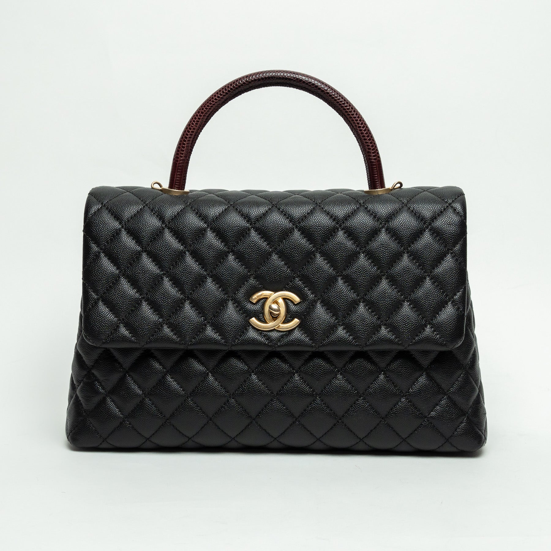 Pre-Loved Chanel™ Black Pebbled Leather Medium Coco Handle Bag with Burgundy Lizard Leather Handle