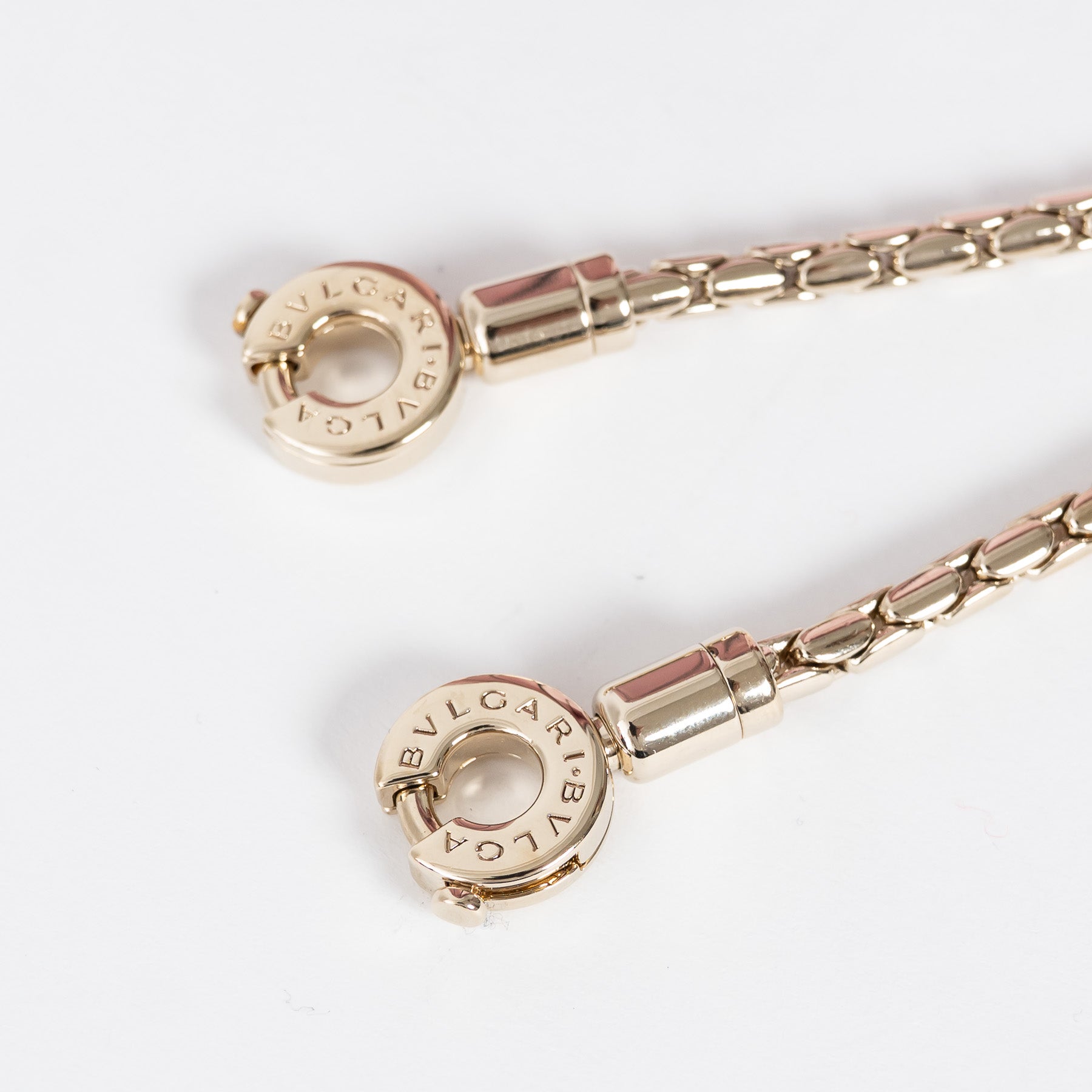 - Exterior Features: Bvlgari gold lettering on back, Top handle, Bvlgari signature serpent clasp made from light gold-plated brass, white enamel, and black onyx scales, Green malachite serpent eyes, Three gussets