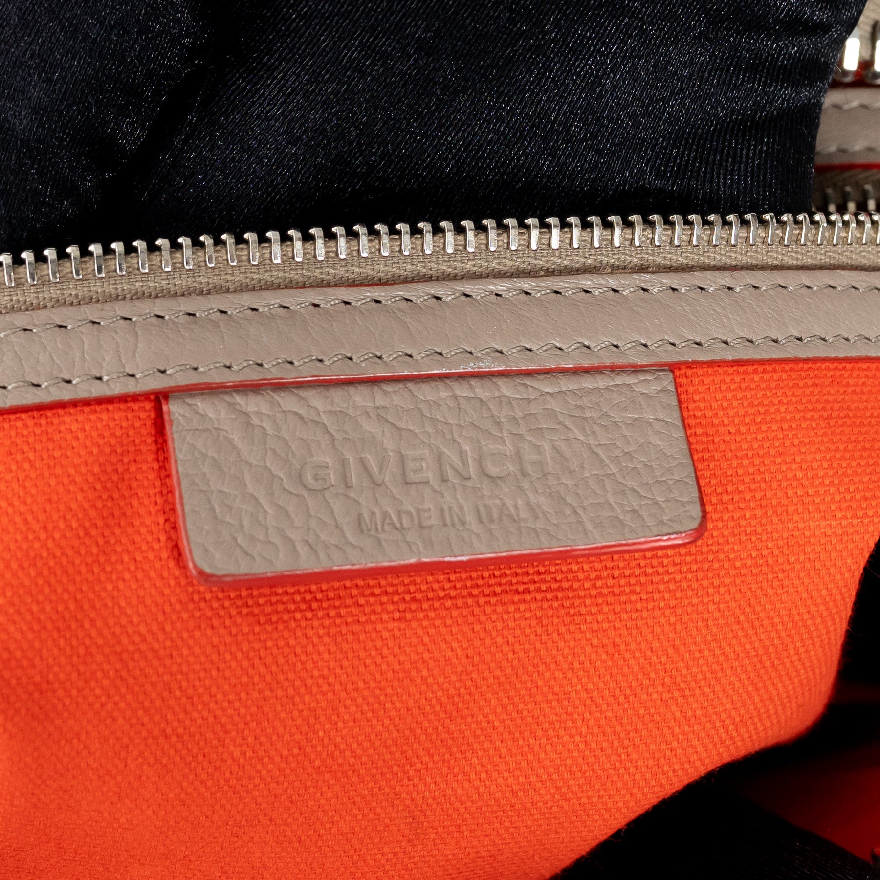Exterior Features: Zipper closure, Debossed Givenchy metal logo on pentagonal patch, Two top leather handles. Orange leather strap with metal details
