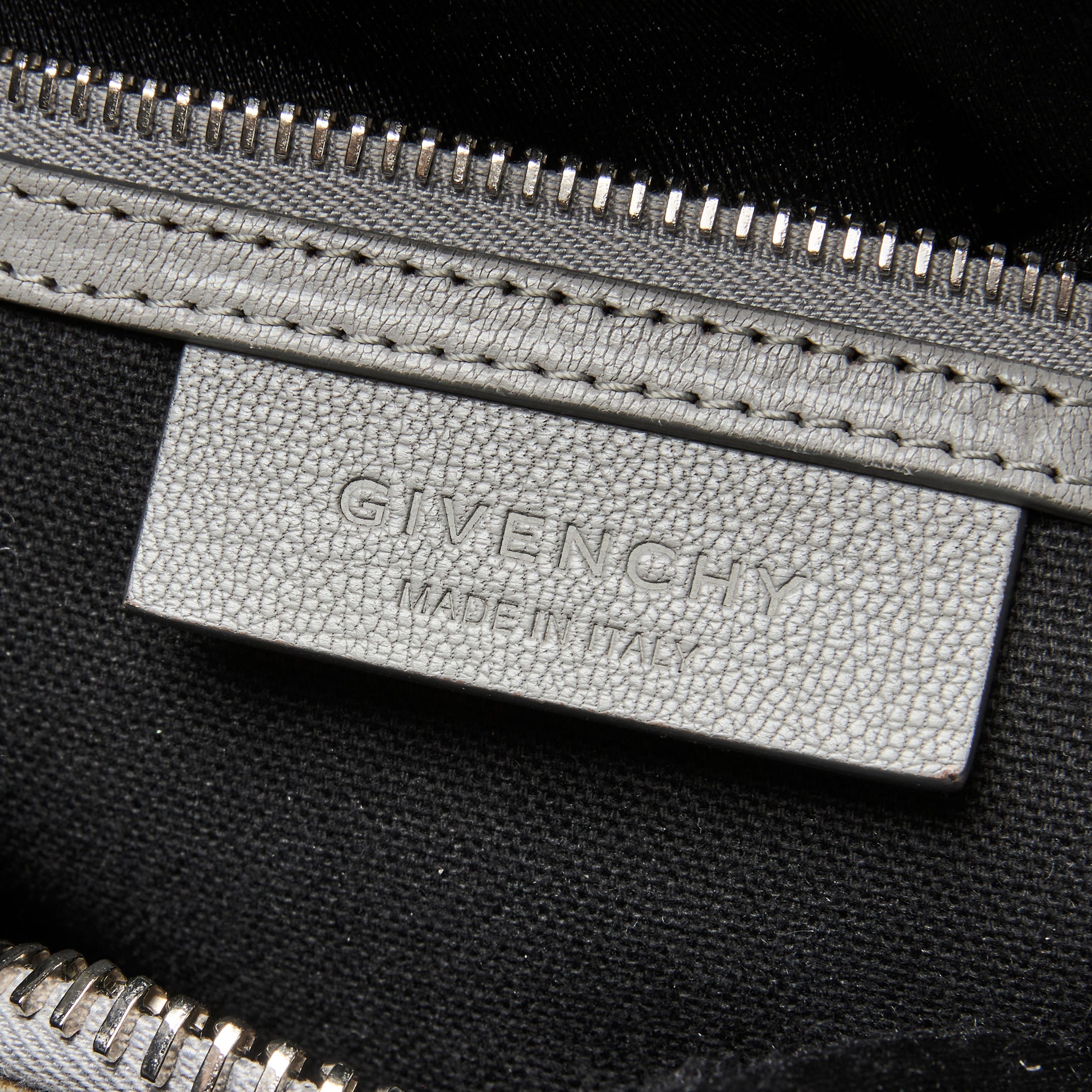 Exterior Features: Zipper closure, Debossed Givenchy metal logo on pentagonal patch, Two top leather handles, Removeable adjustable leather strap