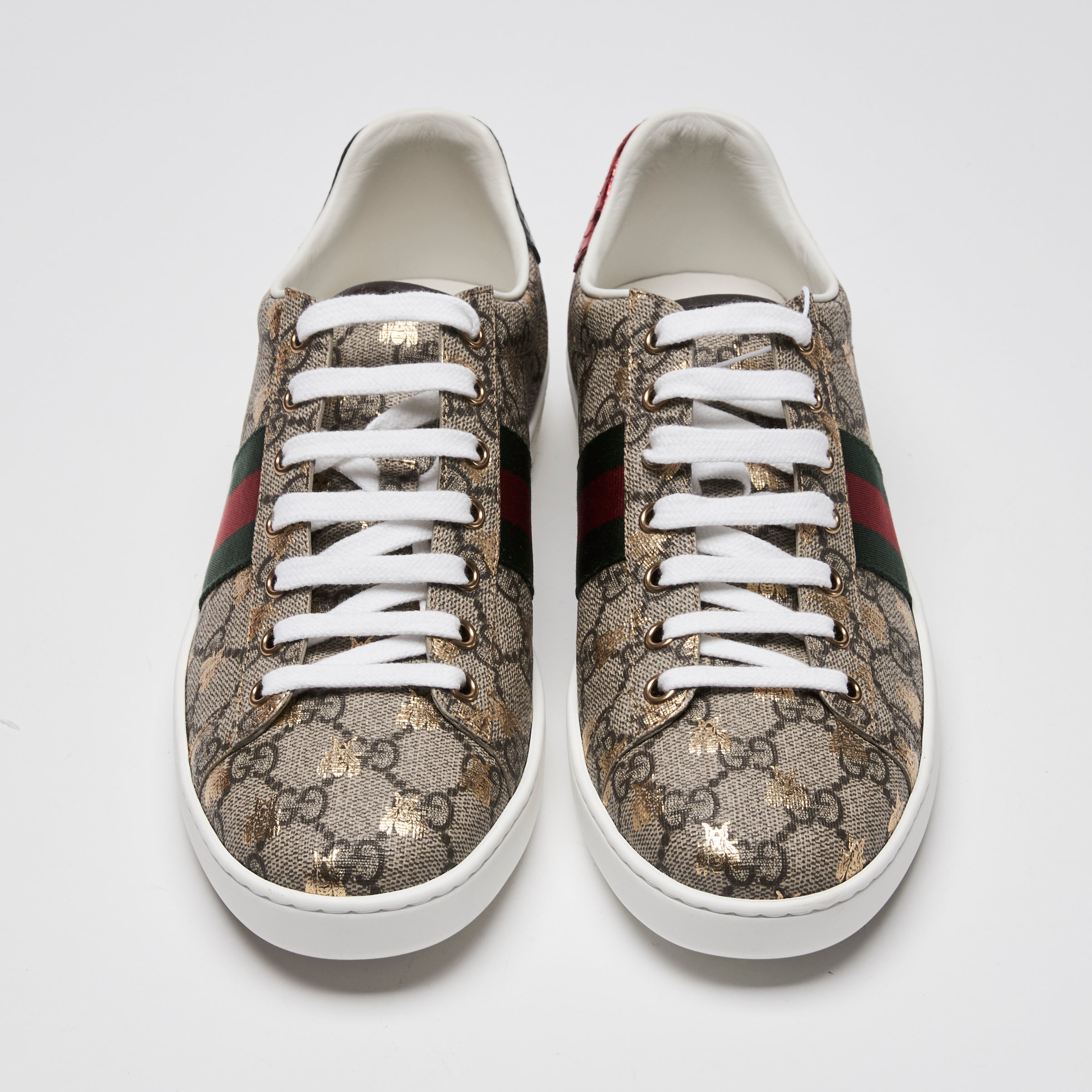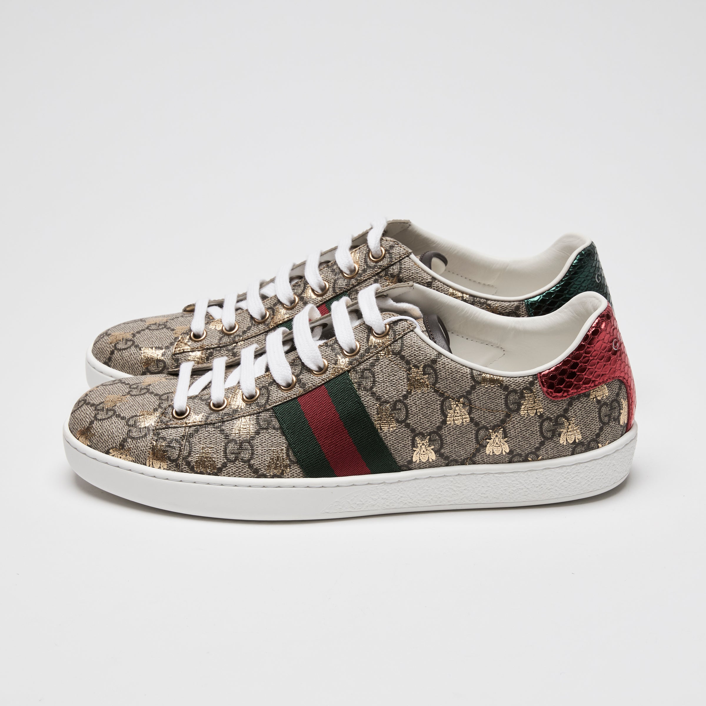 - Details: Closed toe, Lace up, Green red web, Red and green metallic snake embossed leather heel, Gold bee prints, Leather insole
