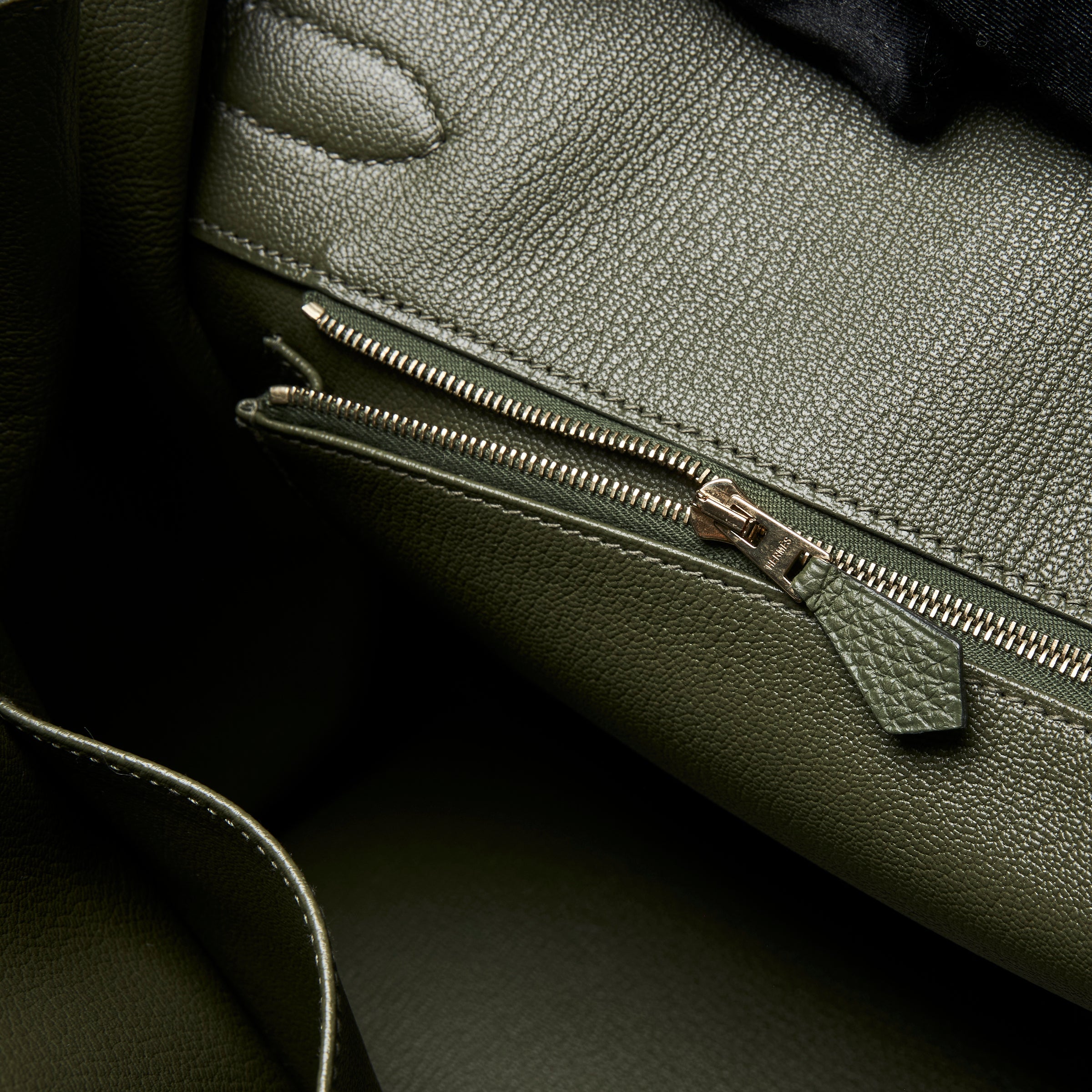 - Interior Features: Leather Lined, One Main Compartment, Side Pocket with Zipper and Leather Pull, Side Pocket