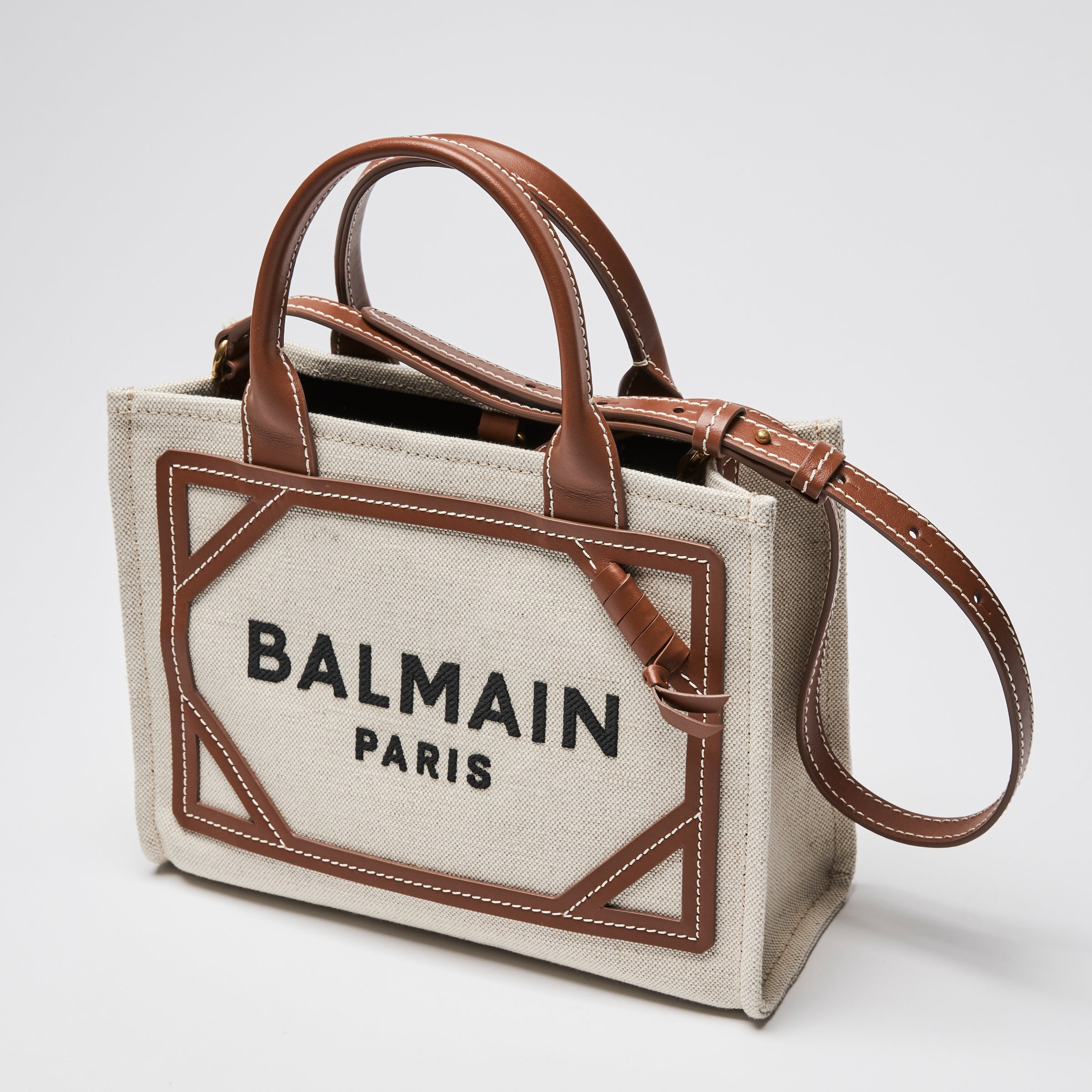 - Exterior Features: Two leather top handles, Leather trim, Woven Balmain lettering, Adjustable leather strap
