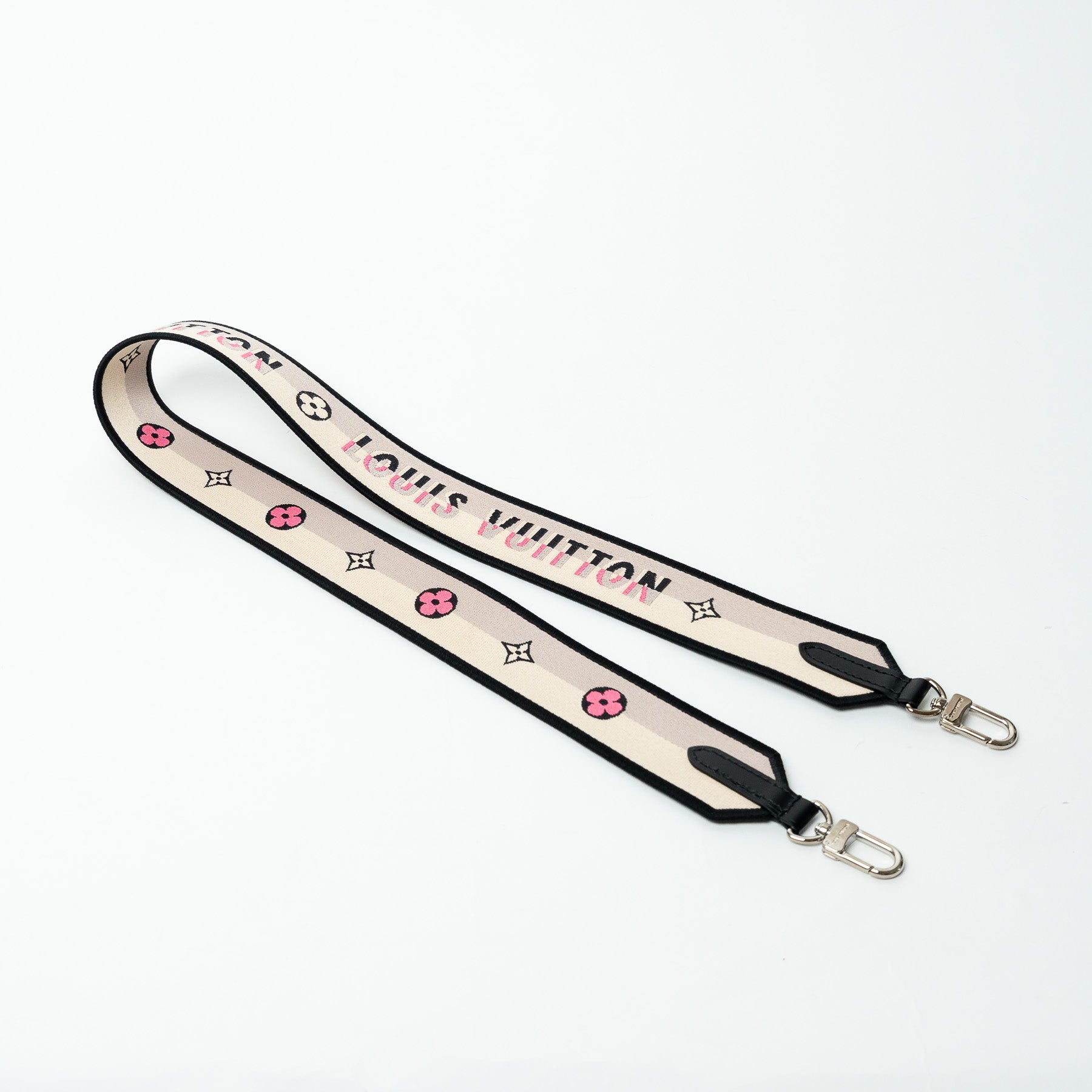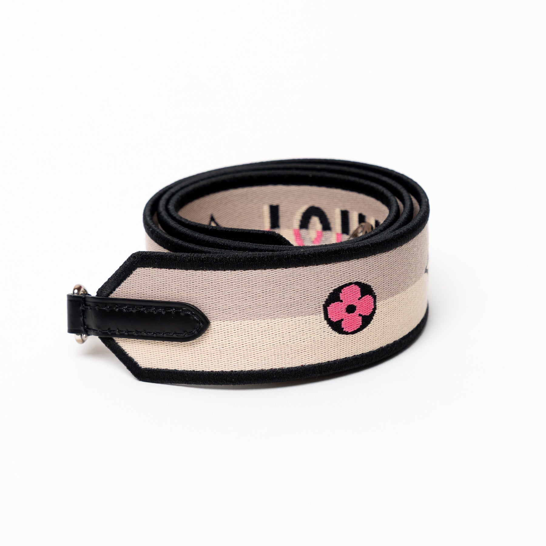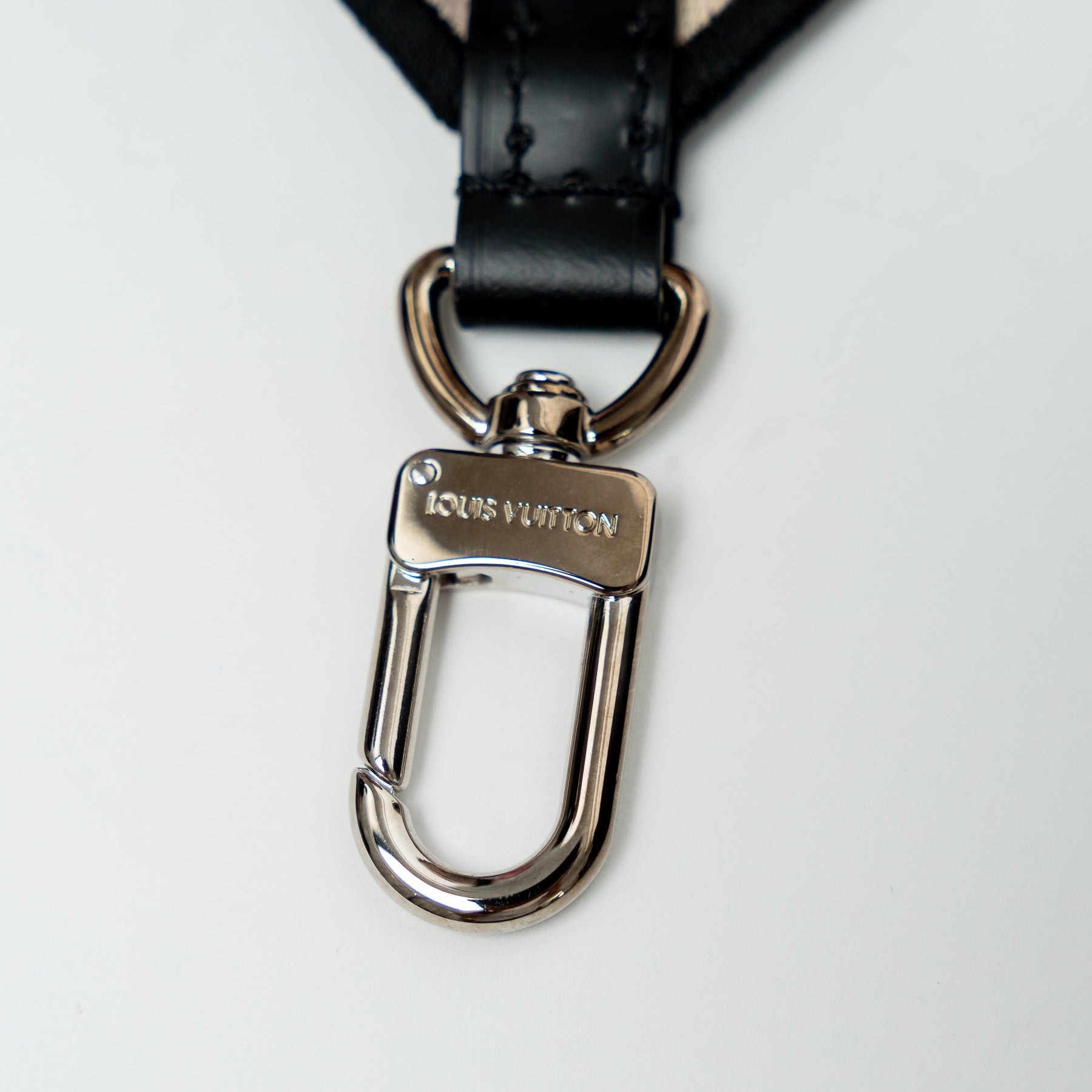 - External Features: Black leather trim, Double zipper closure, Lock, Leather tag with key, Two top handles, Embossed LV logo, Removeable guitar strap