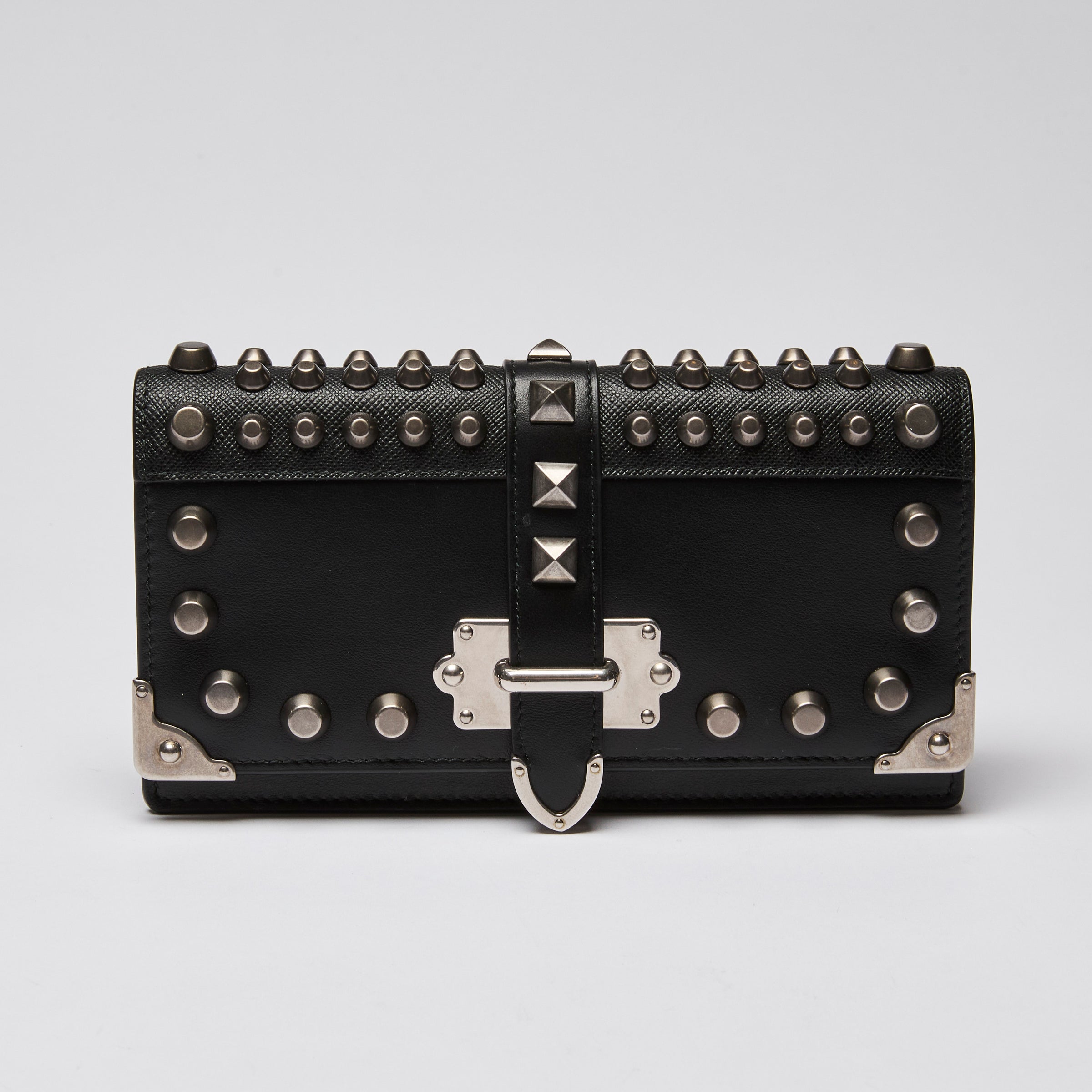 Prada Black City Calf & Saffiano Leather Studded Cahier Crossbody Wallet on Chain