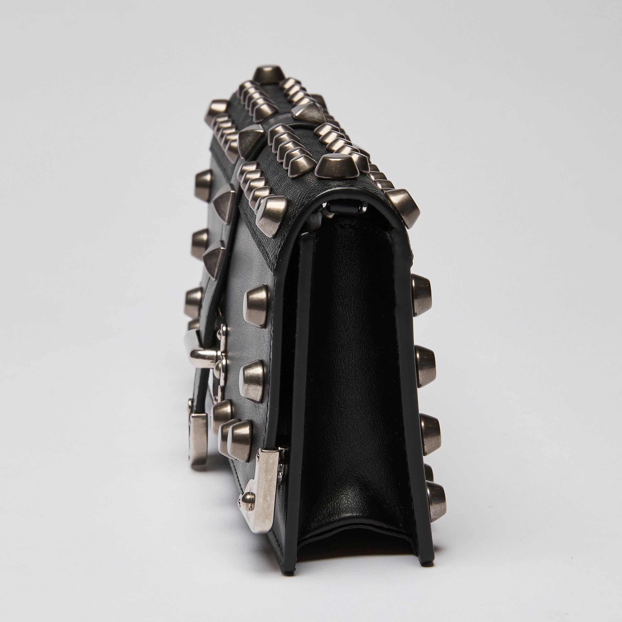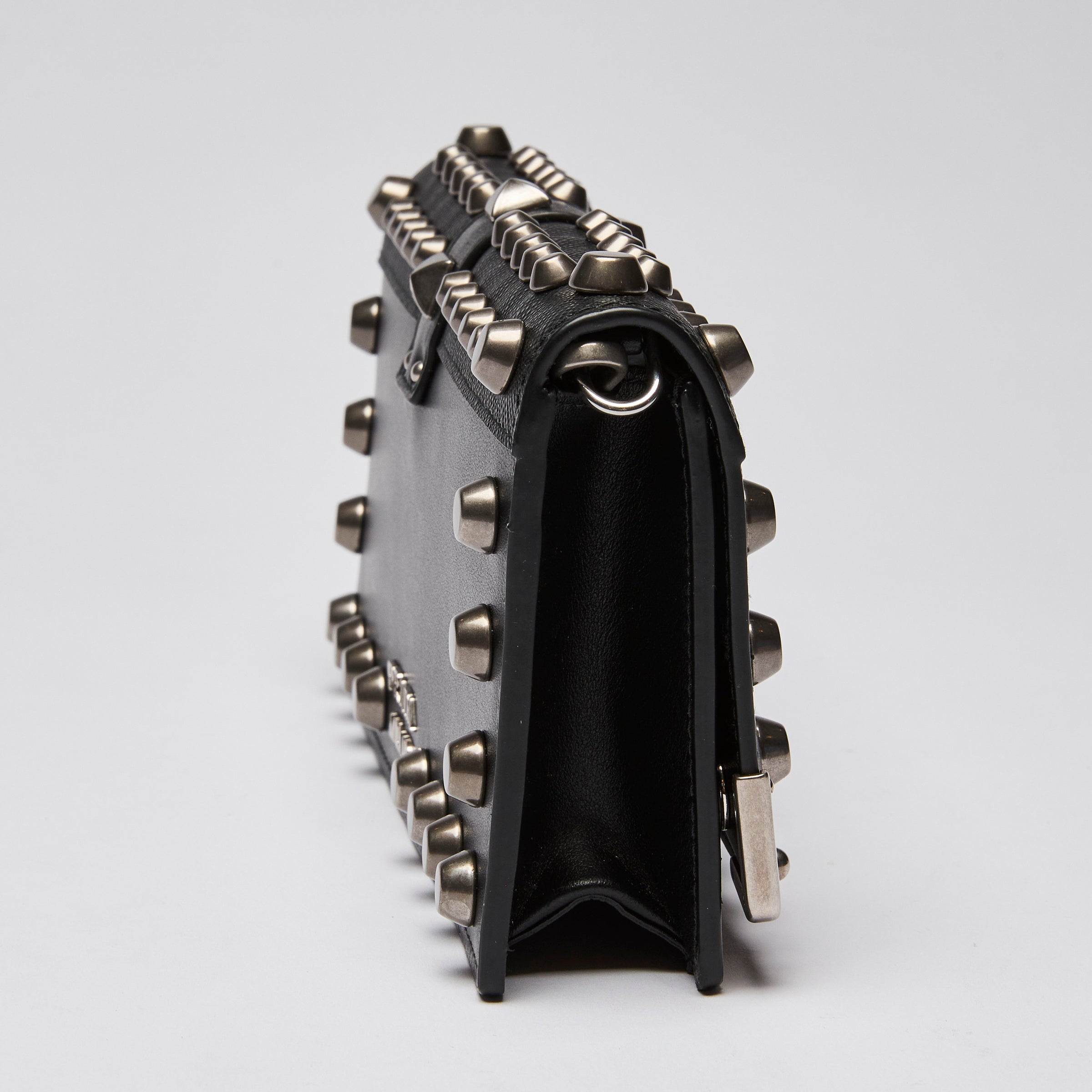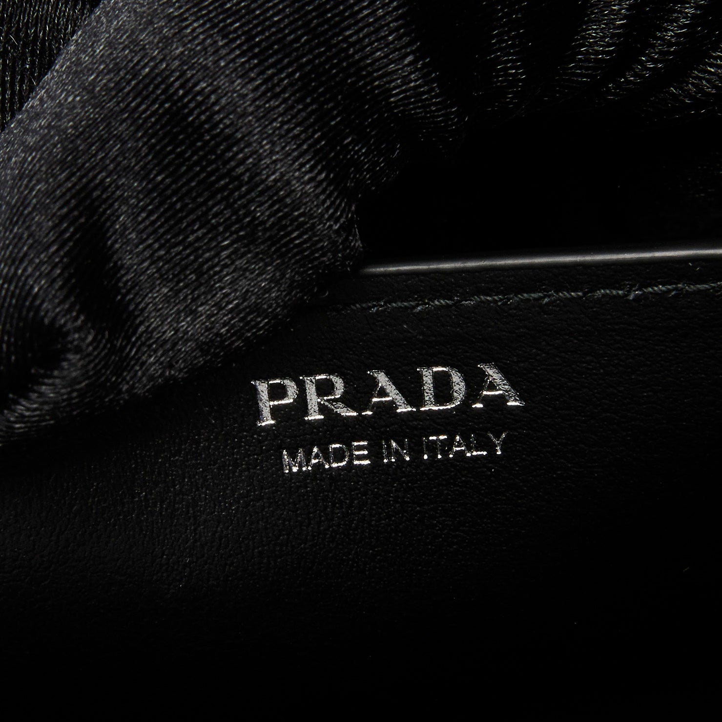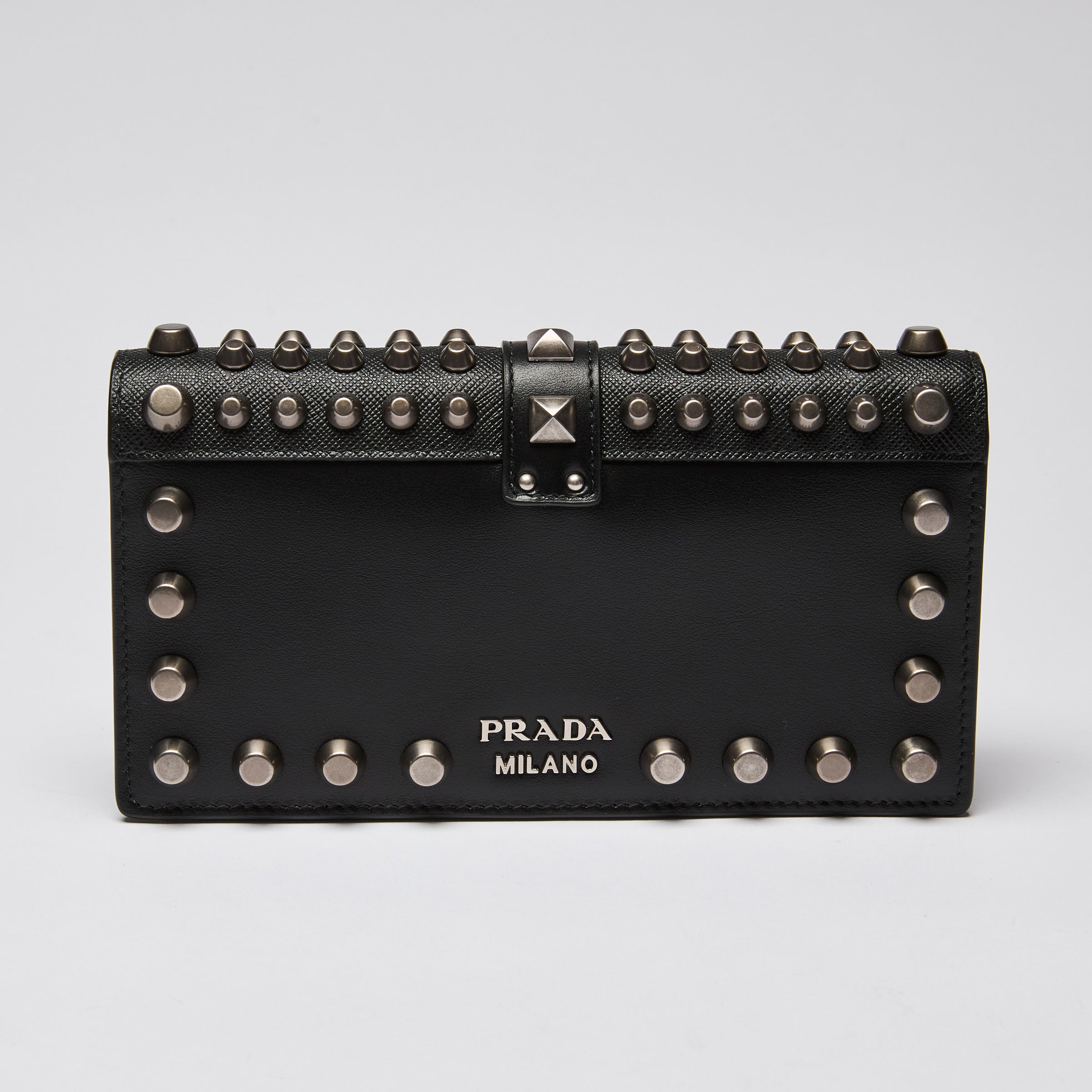 - Exterior Features: Silver studs. Magnetic clasp closure, Metal Prada logo on back