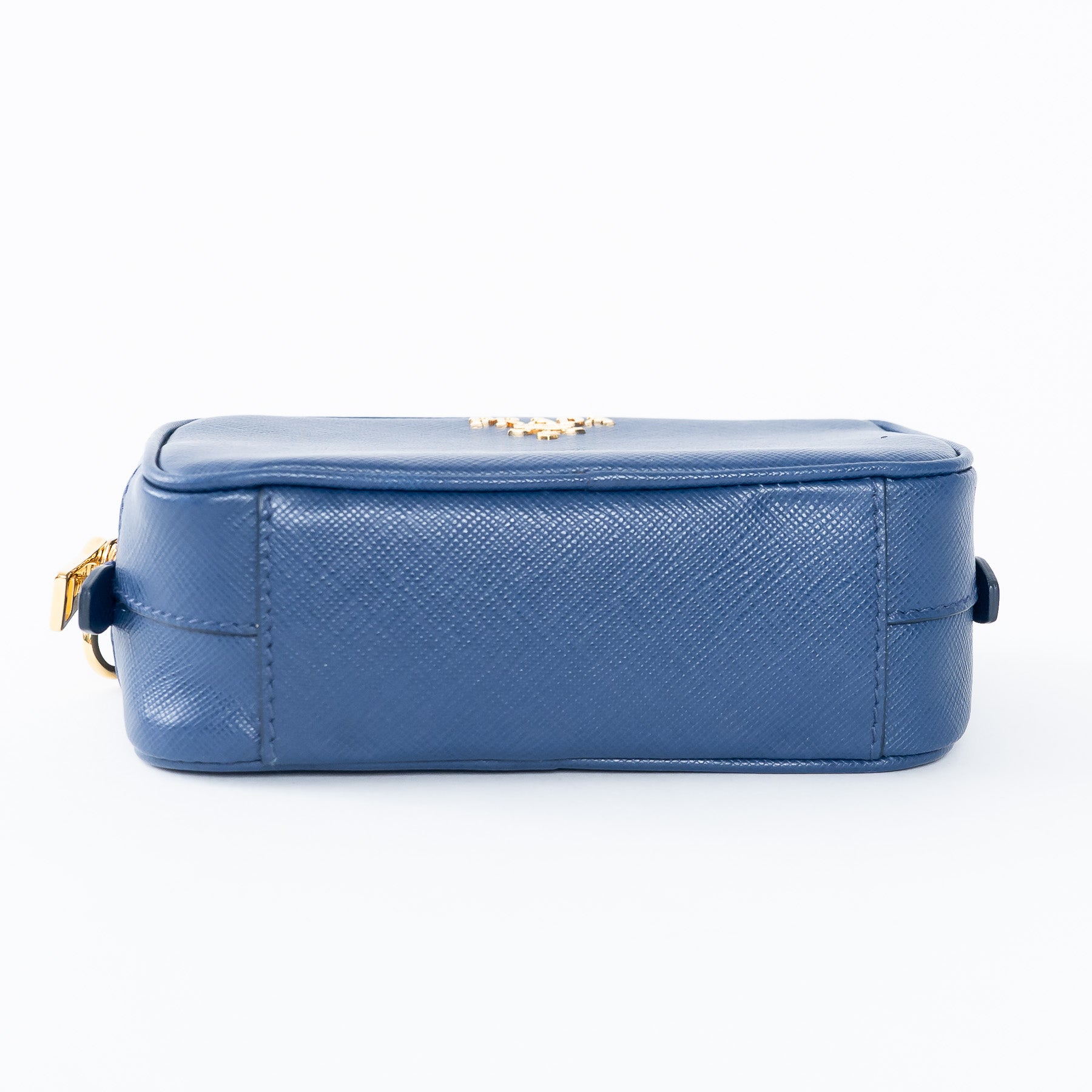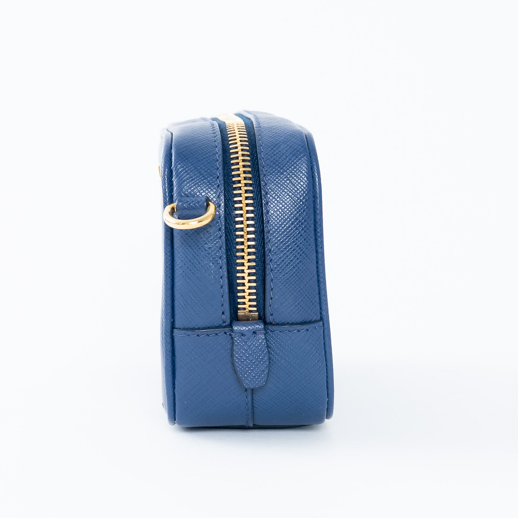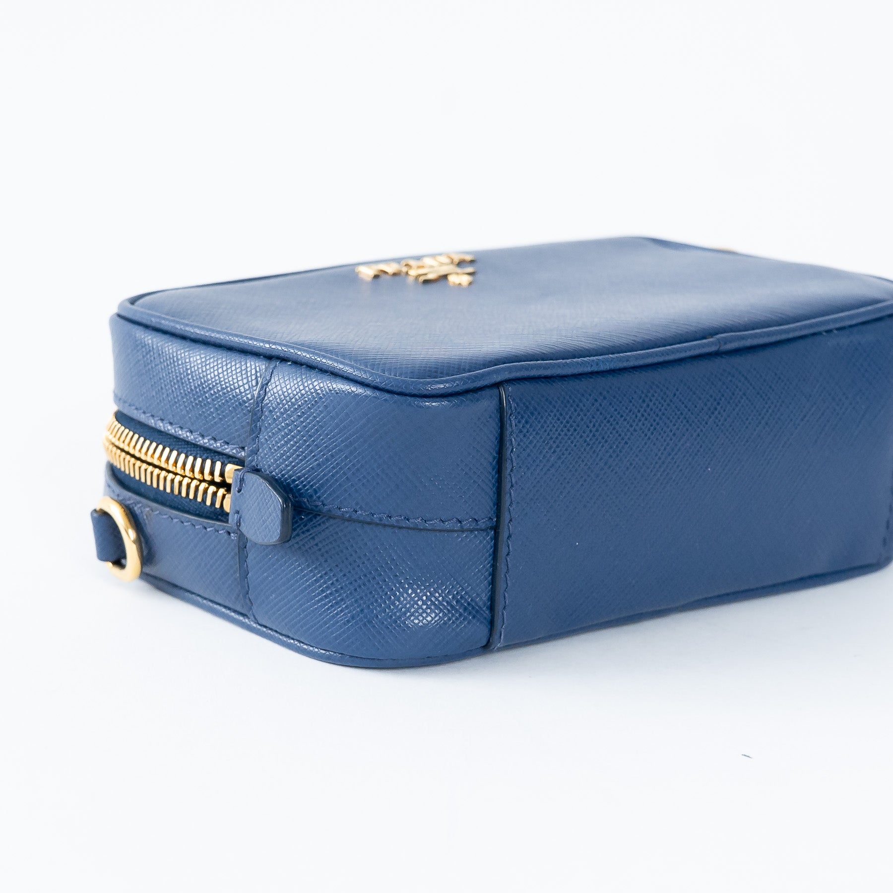 - Exterior Features: Crossbody camera-style bag crafted in blue saffiano leather with gold hardware plaque on the front of the bag
