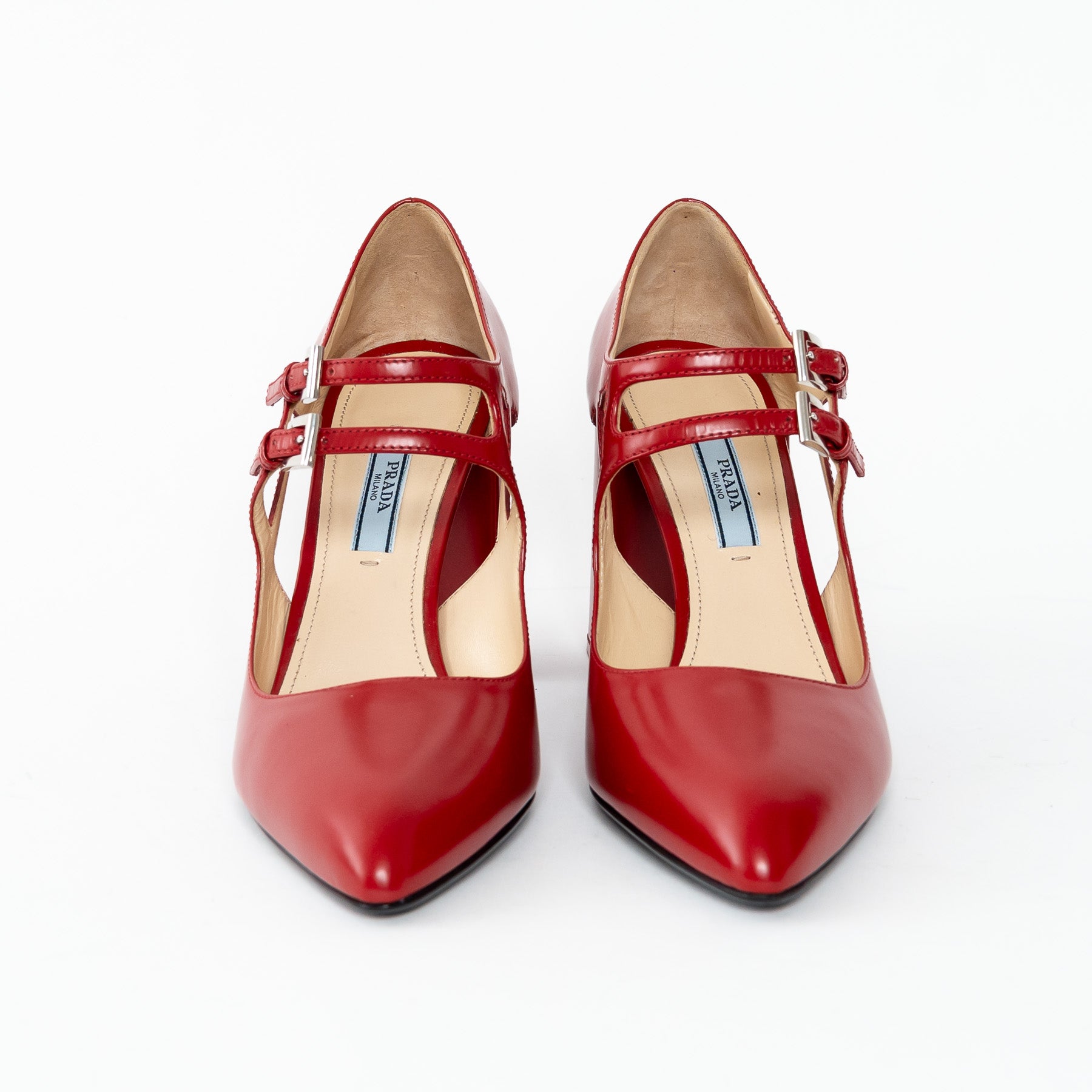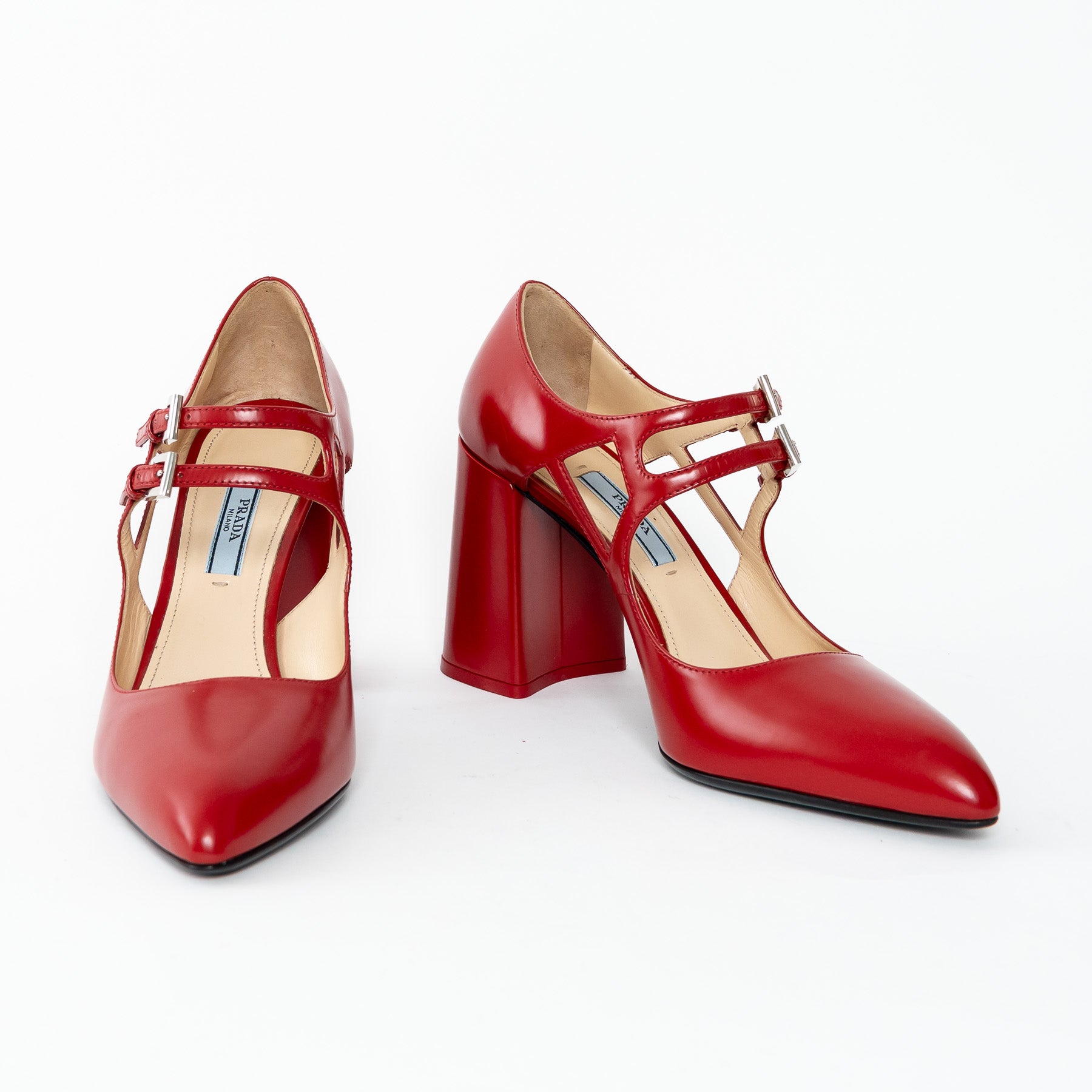 Prada Red Smooth Leather Block Heel Mary Jane Pumps Size 38.5