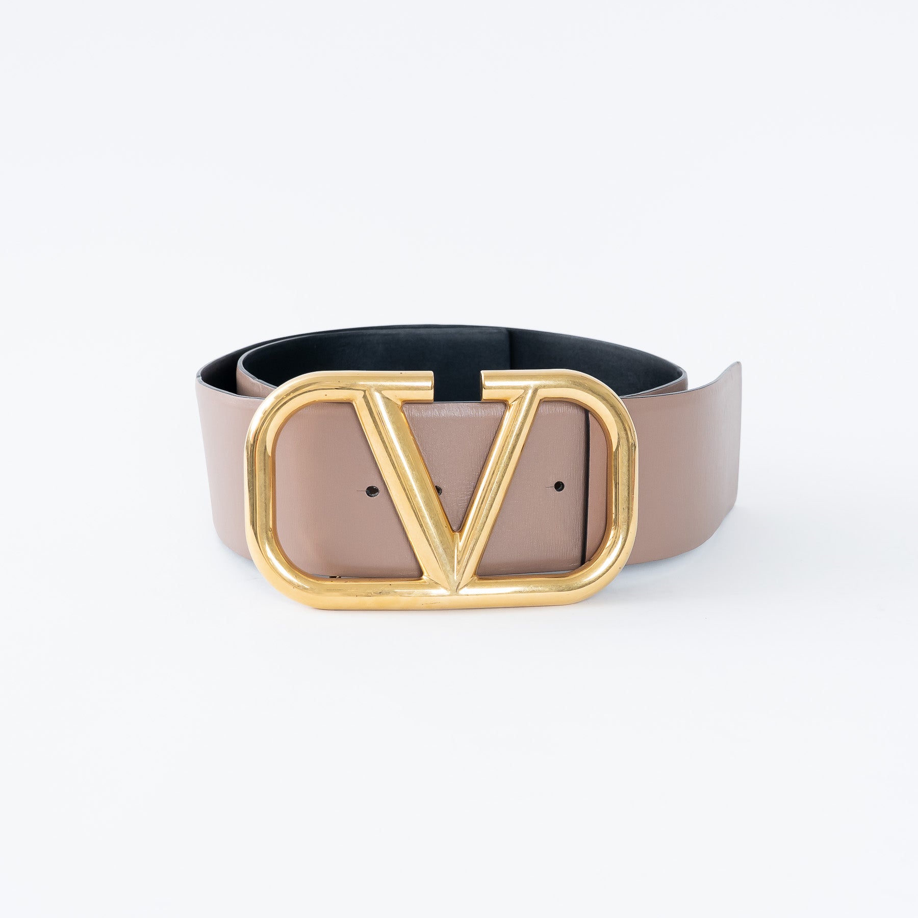 - Details: Thick leather belt, gold-tone Vlogo belt buckle, five size adjustment holes