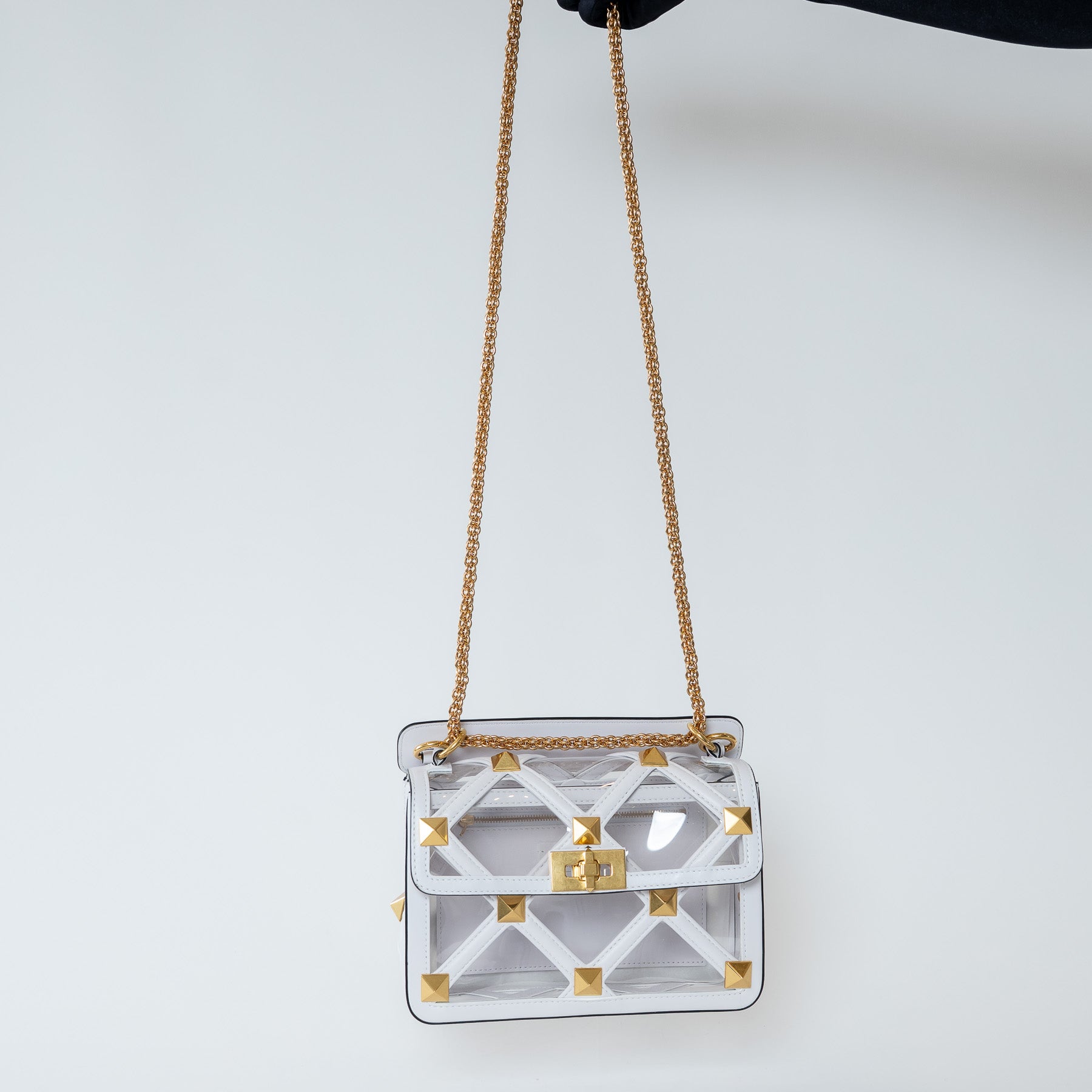 - Exterior Features: Turn lock closure, Top handle, Leather strap with lobster claw clasps, Chain, Signature Valentino Roman stud,