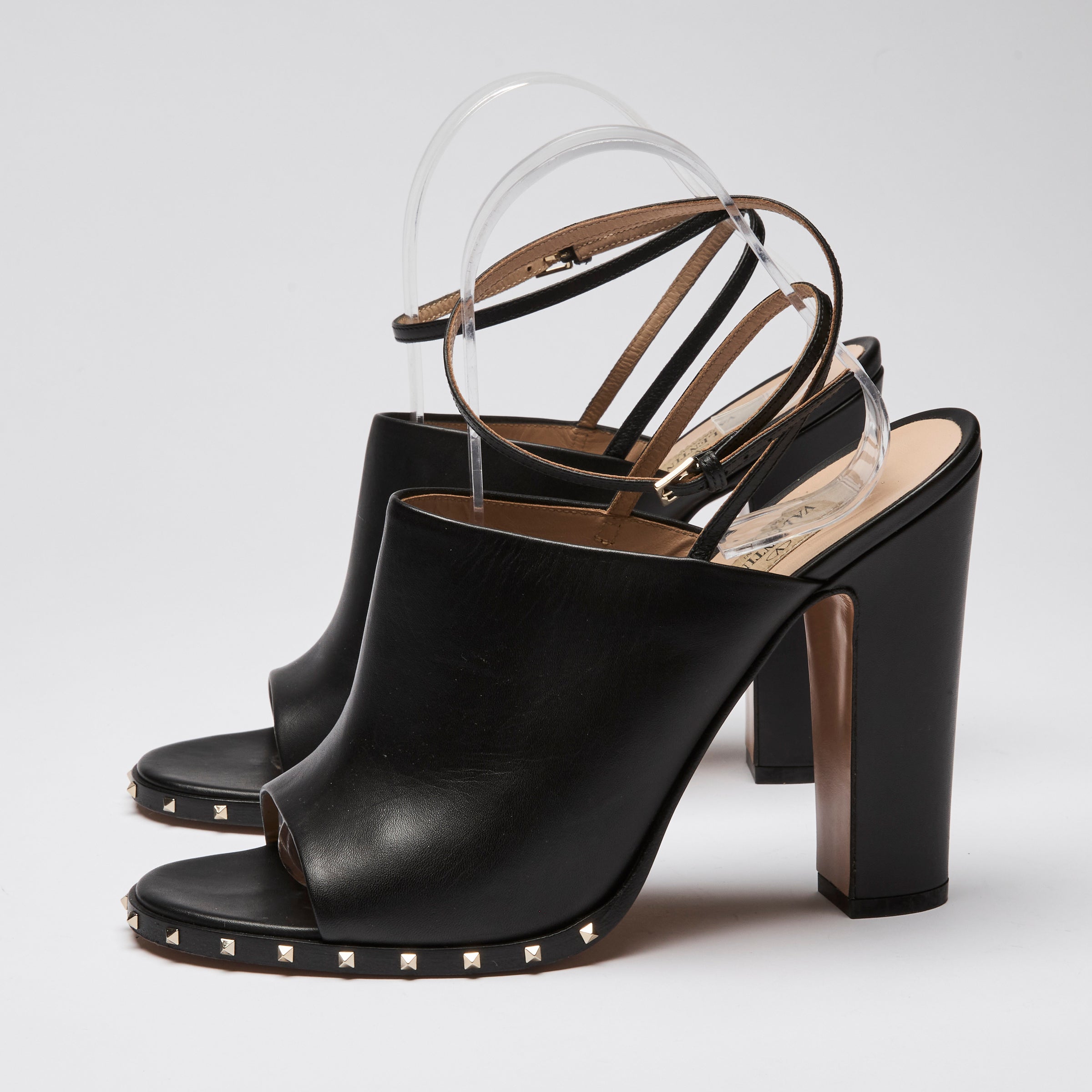 - Features: Stacket heel, studs along lower sole, thin leather ankle strap. Fully leather lined