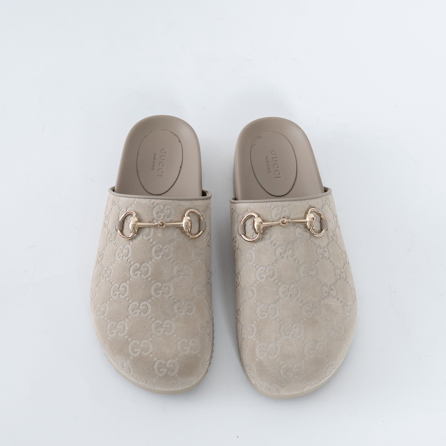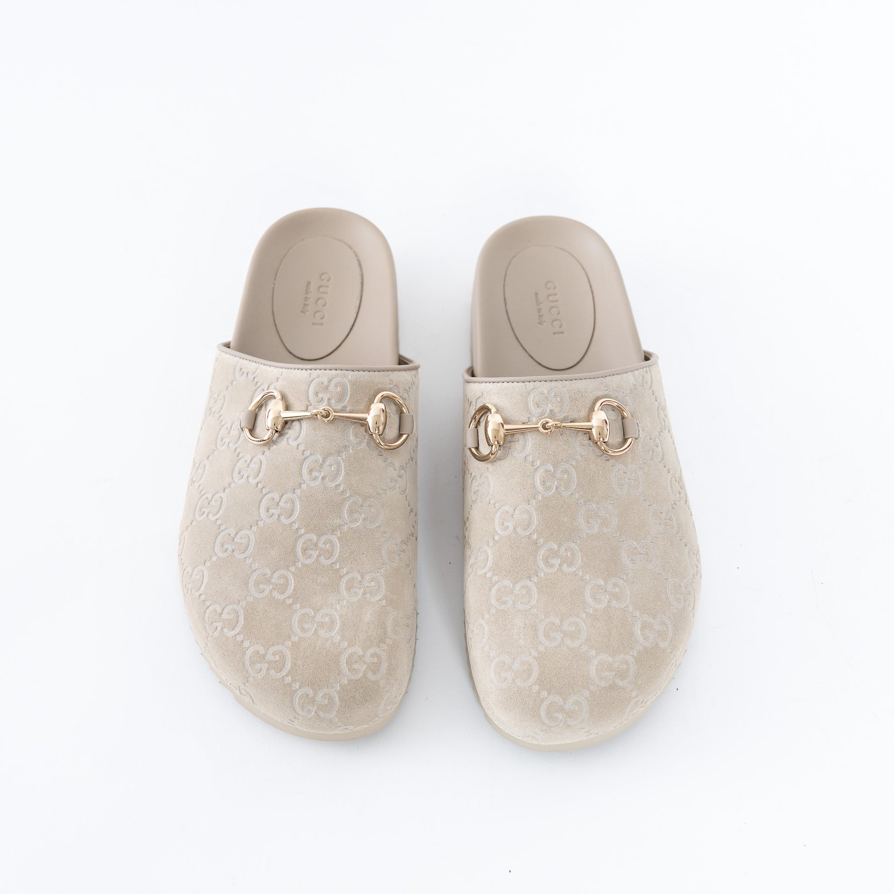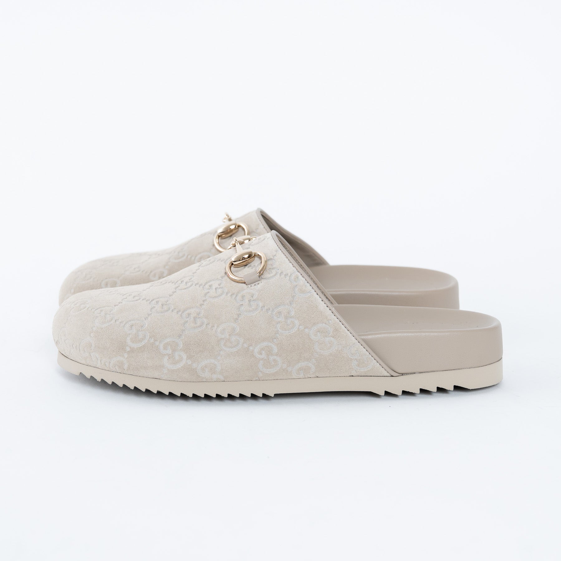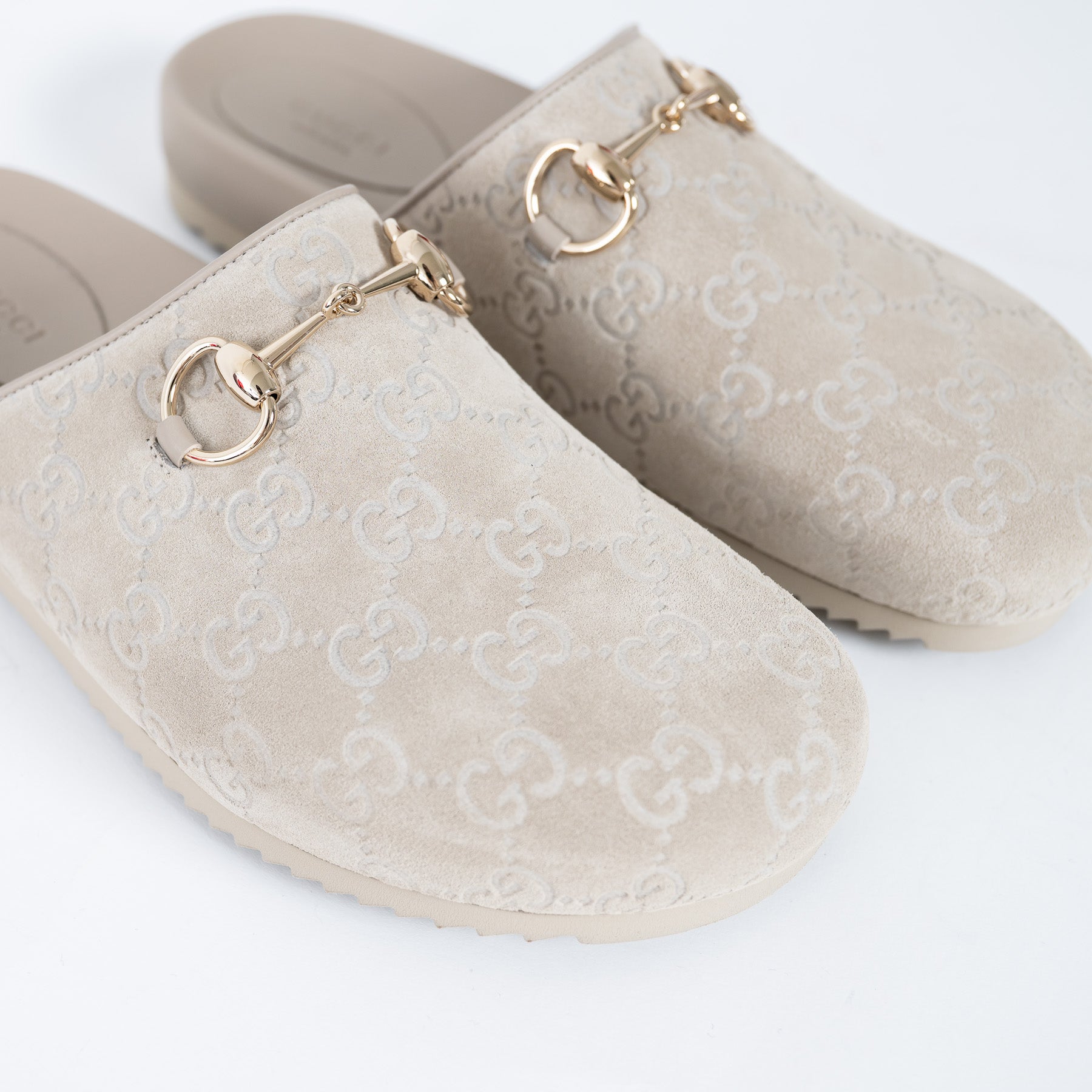 - Features: Suede embossed monogram mules with classic Horsebit detail in gold-tone hardware, rubber sole