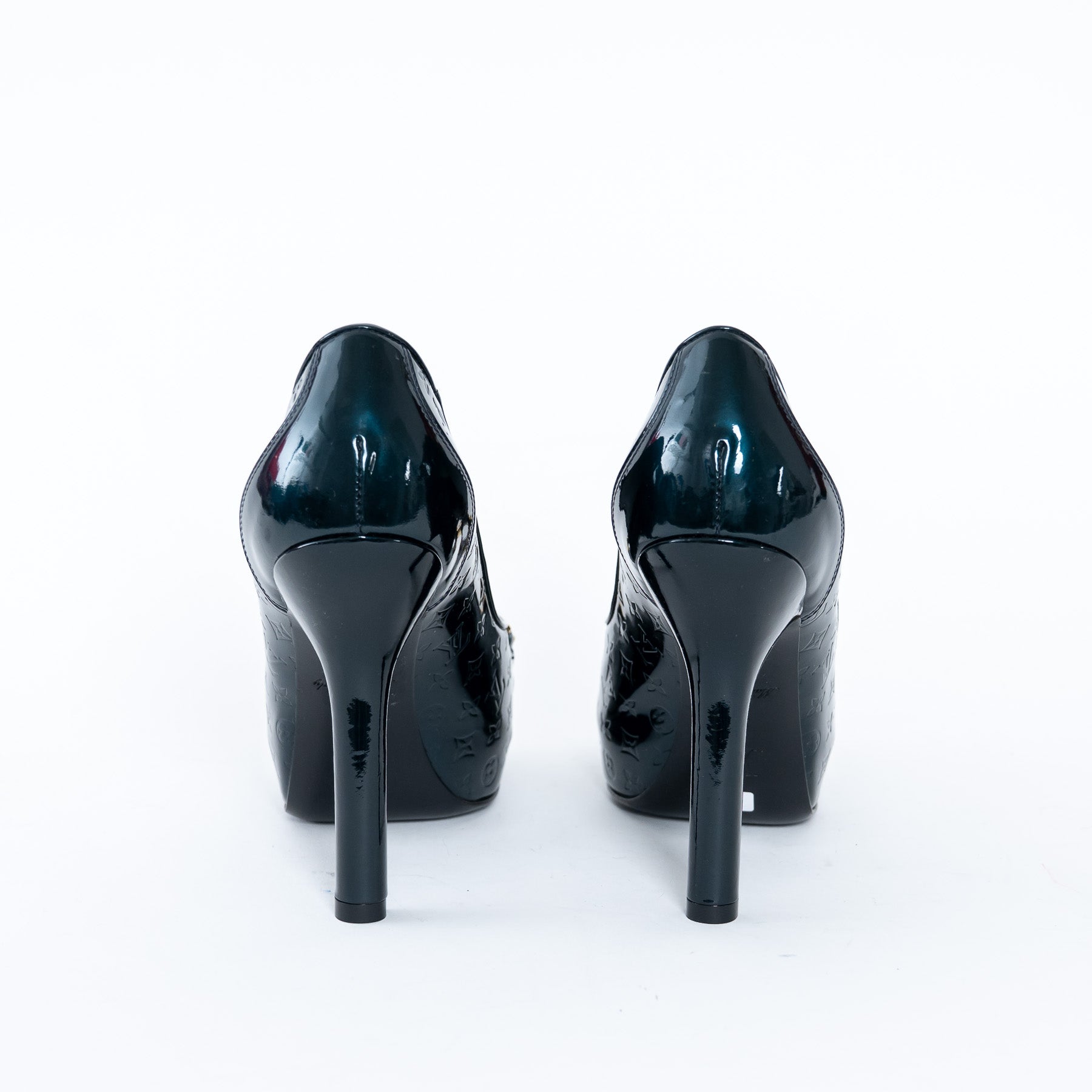 - Features: Outer crafted in dark green patent leather with LV monogram embossed throughout, peep toe, and bold gold-tone hardware detail