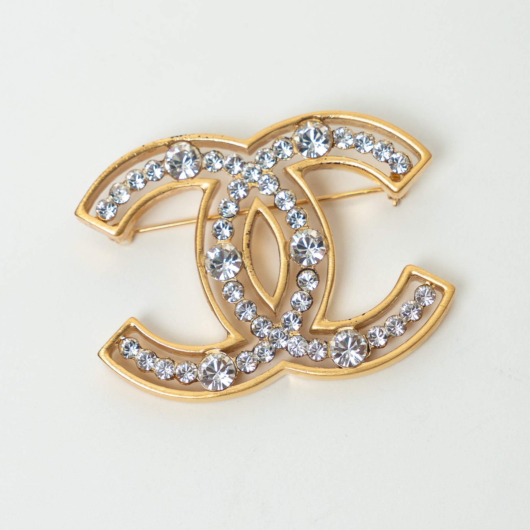 Pre-Loved Chanel™ Gold Tone Crystal Embellished Cut Out Logo Brooch