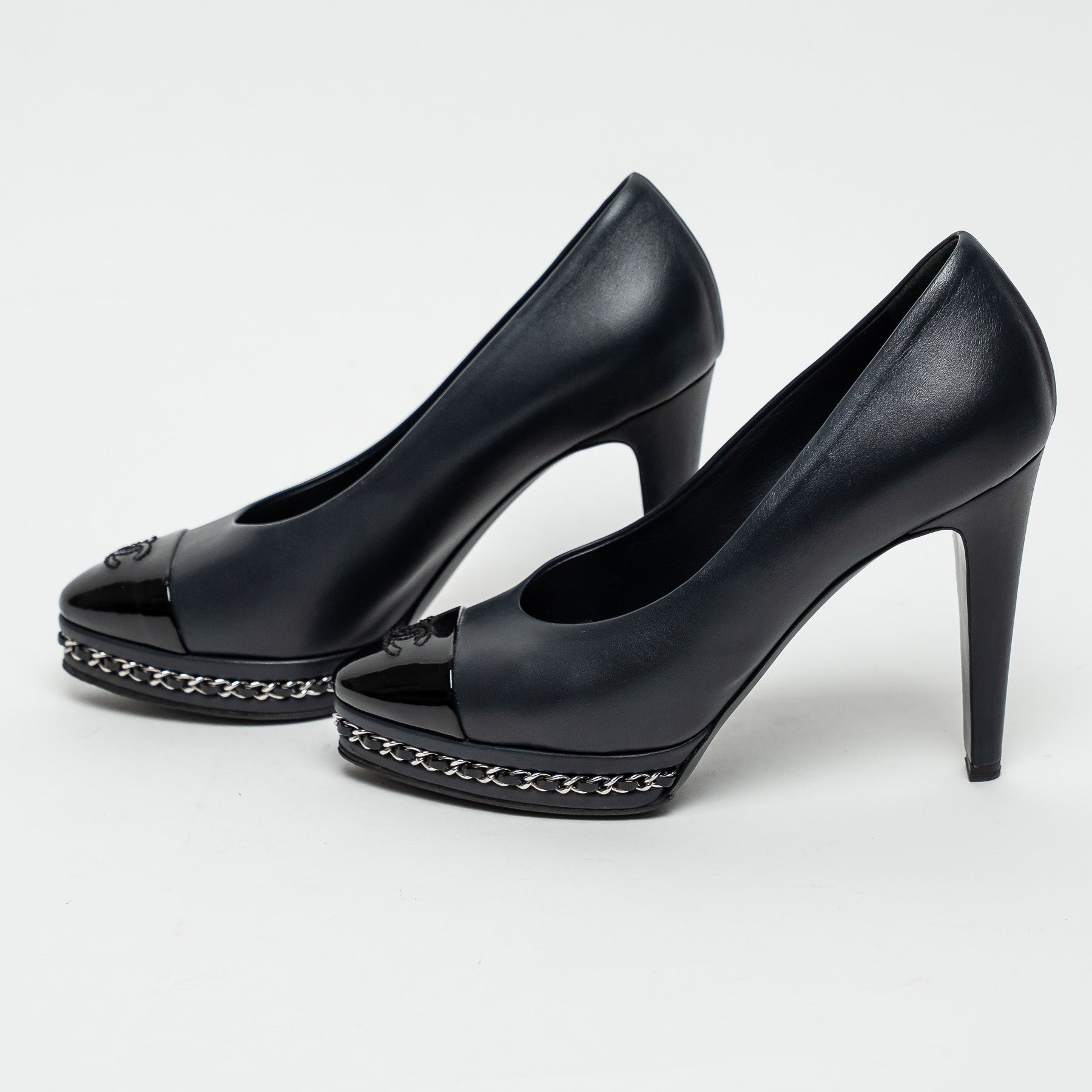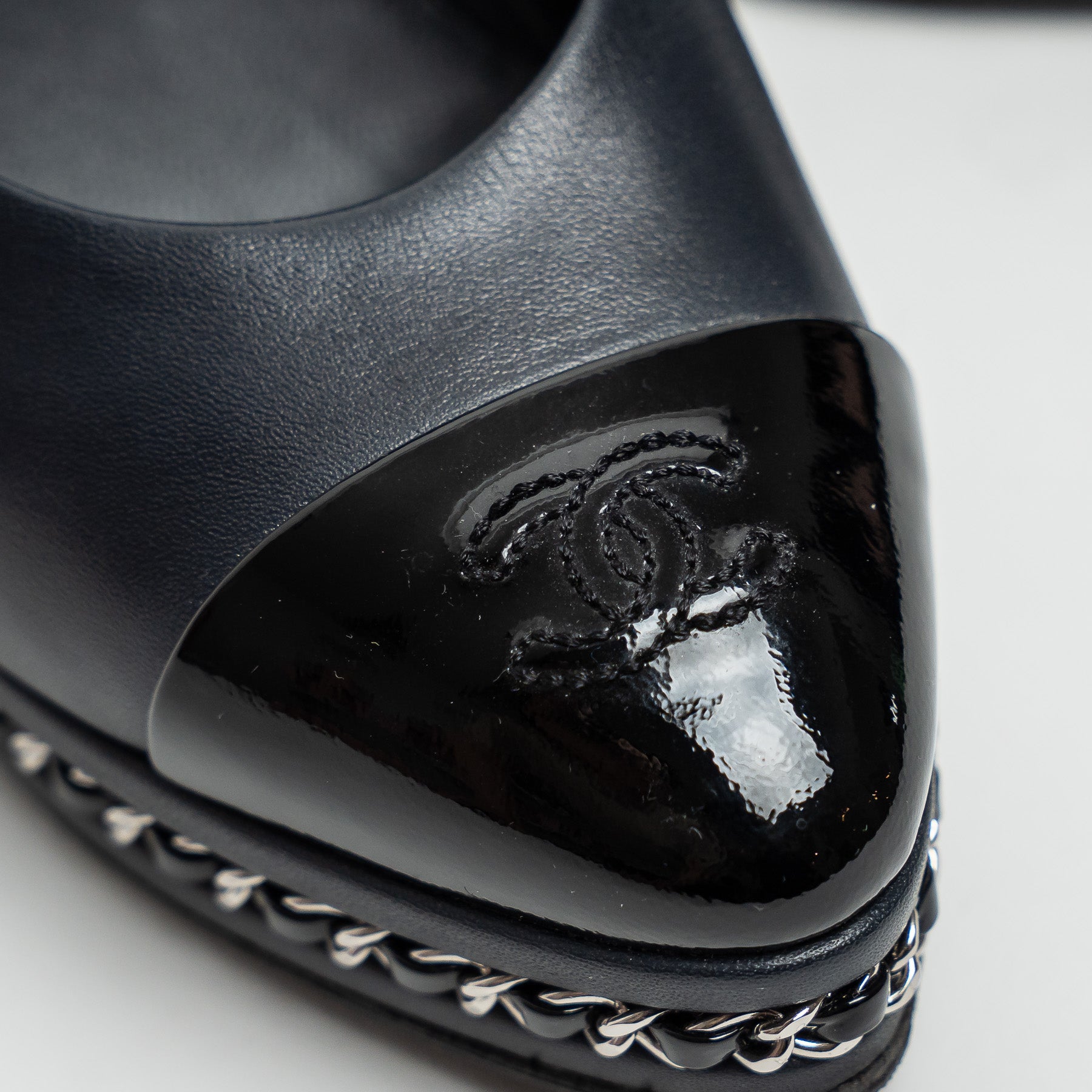 - Features: Interlocking chain and leather detail on outer platform, Black patent leather toe box, Pointed toe, Leather insole