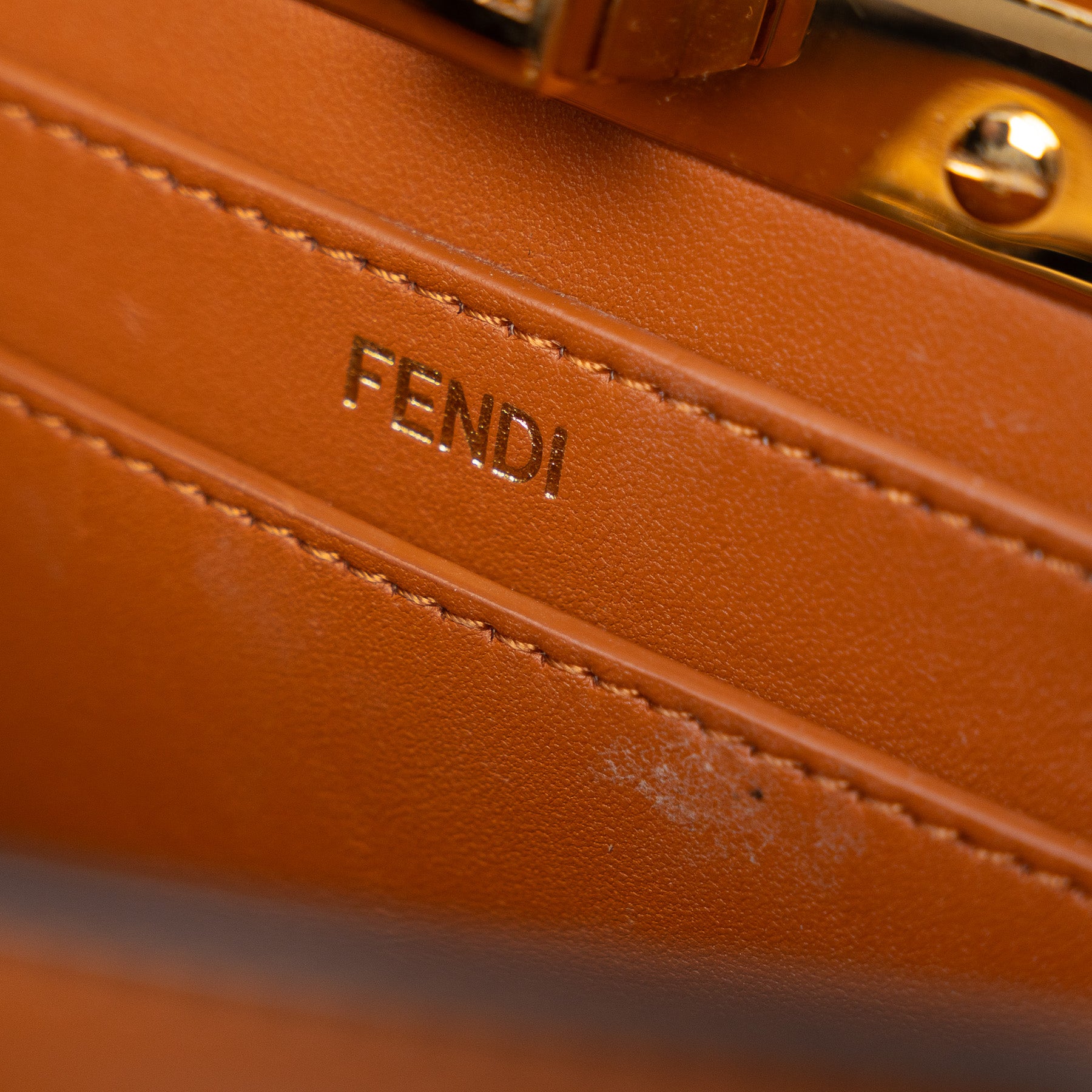 - Exterior Features: Leather outer with brushed gold turnlock closure on either side of the top handle to reveal two inner compartments