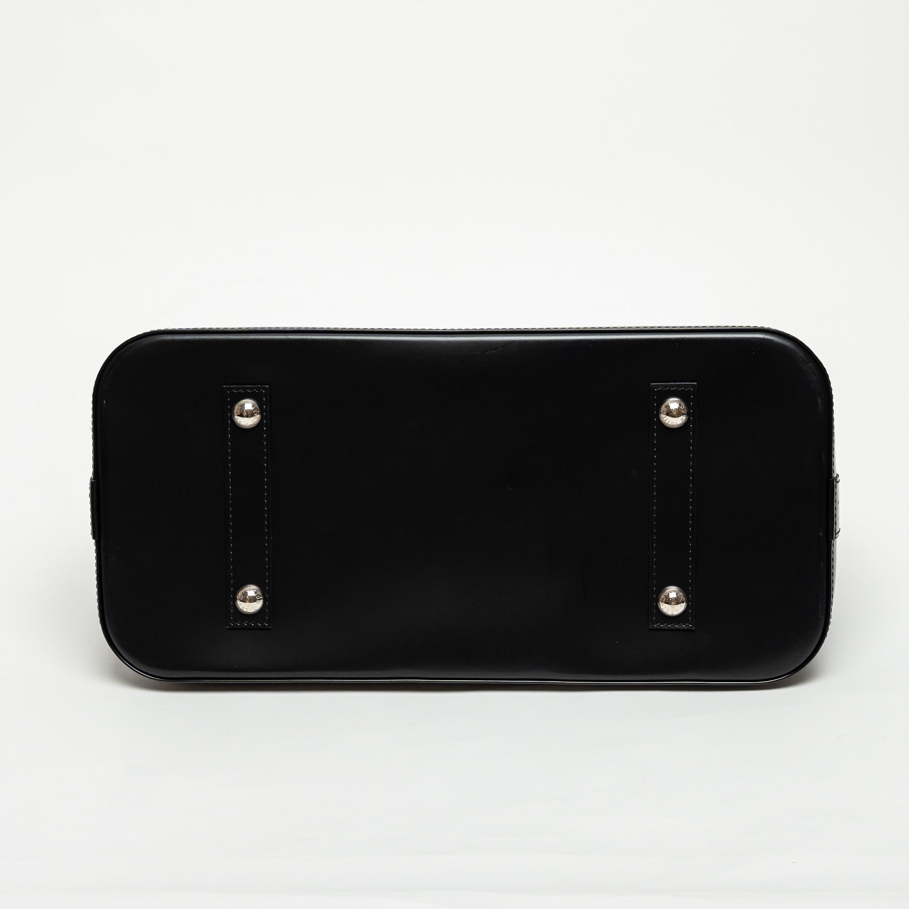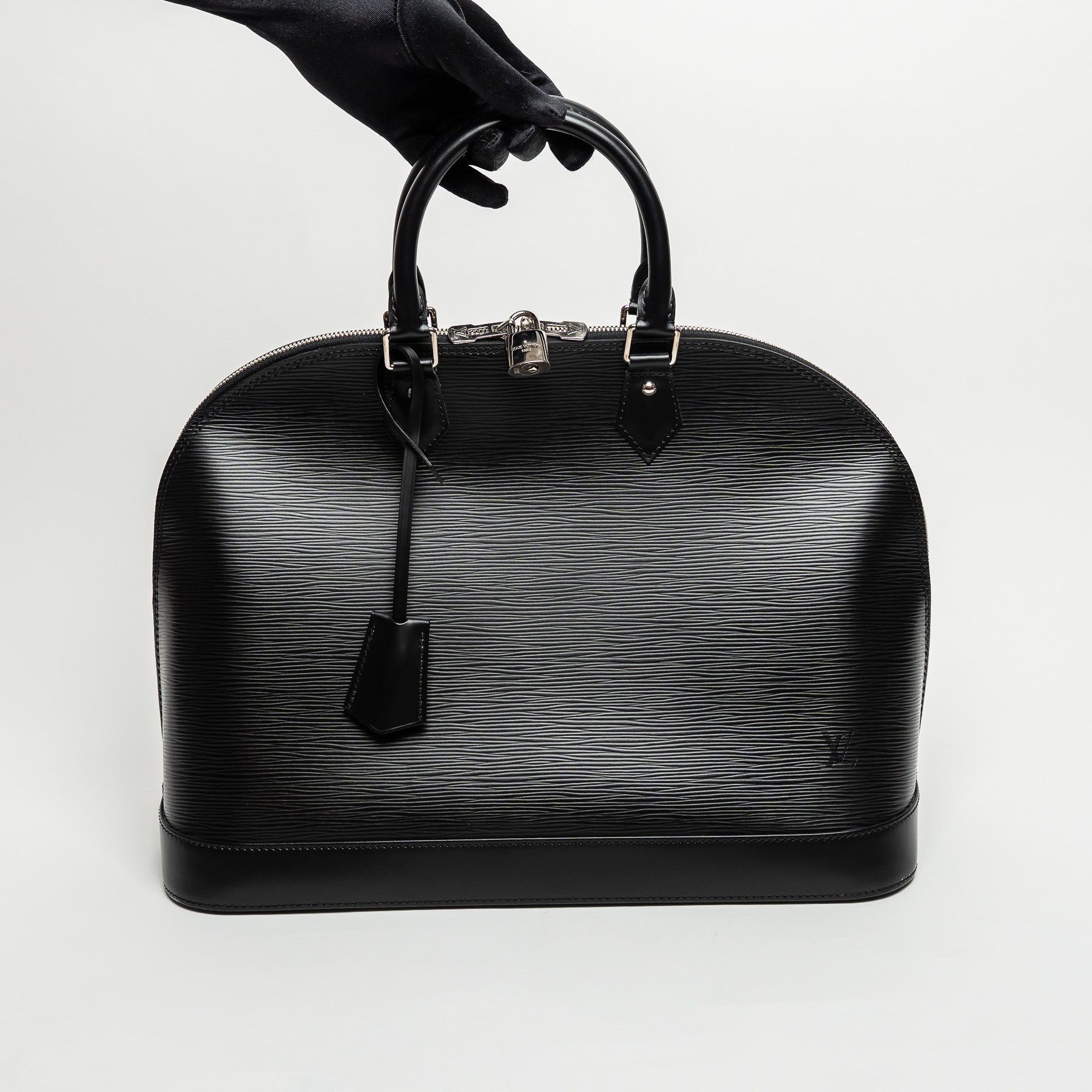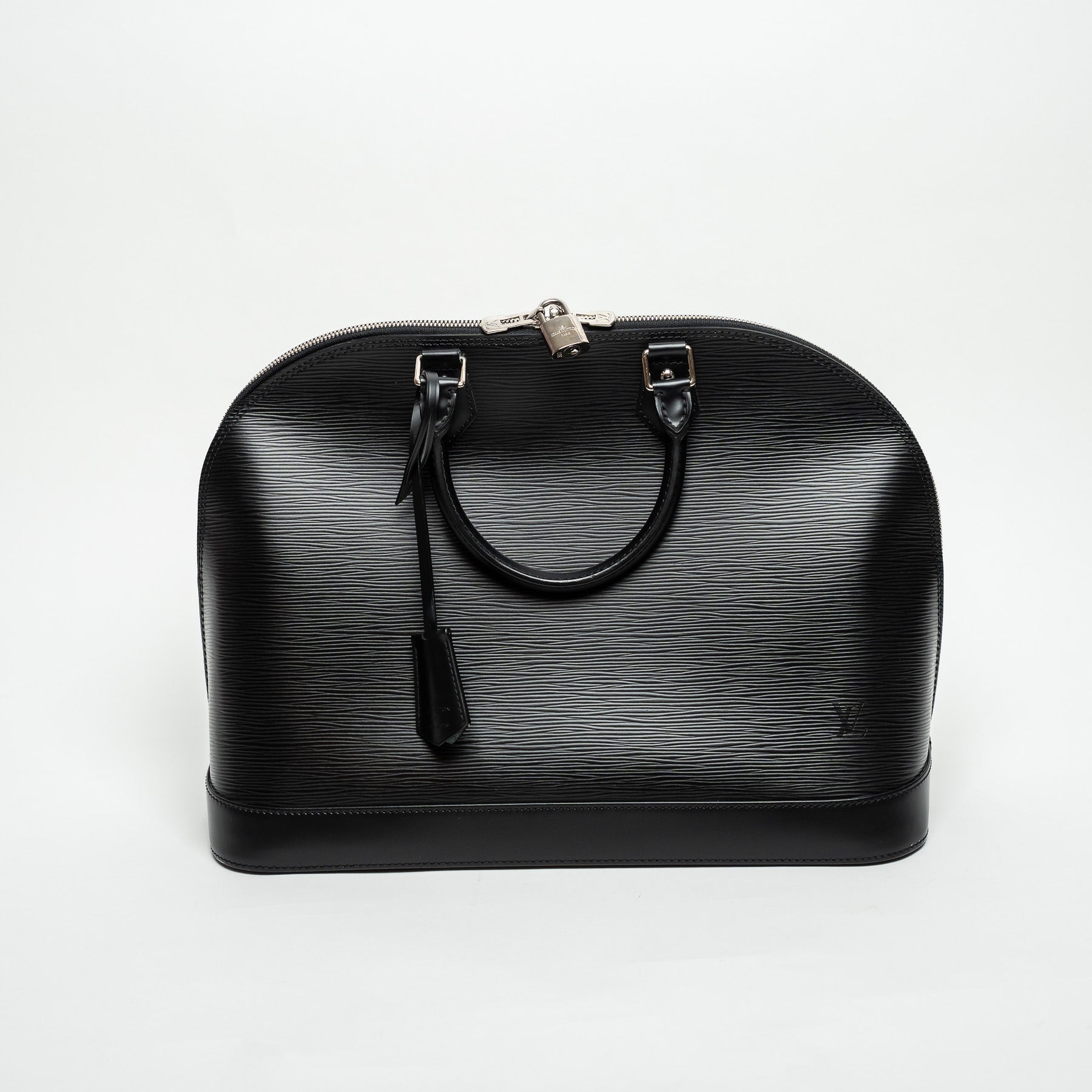 - External Features: Black leather trim, Double zipper closure, Lock, Leather tag with key, Two top handles, Embossed LV logo, Four protective studs at base